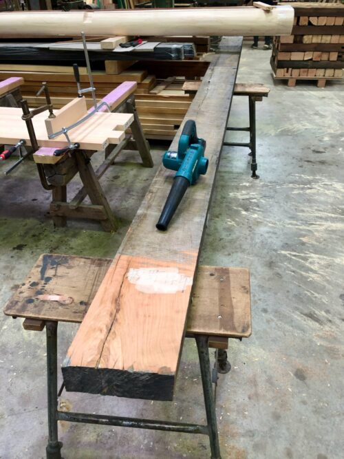 畳コーナーの框に使用する『無垢サクラ材』を加工場に来ていただき、最終確認をするところです。