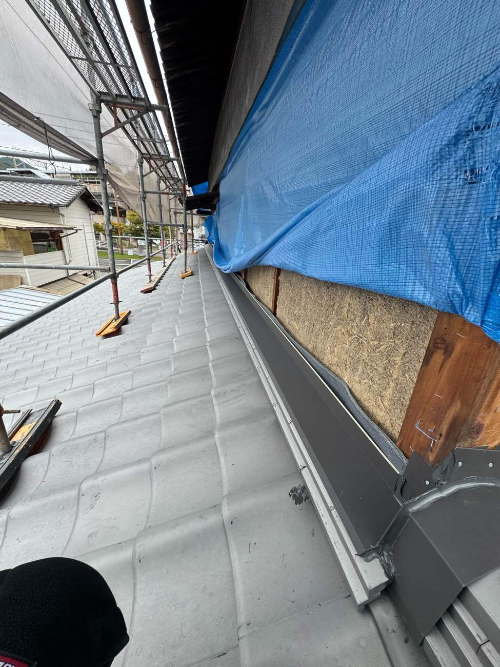 写真が全体に青~く映っているのは養生のブルーシートのせいです。
