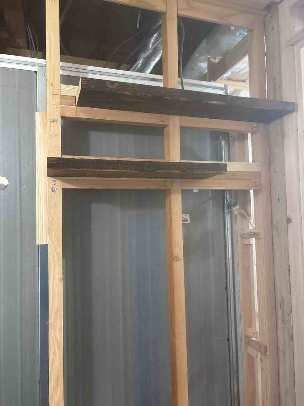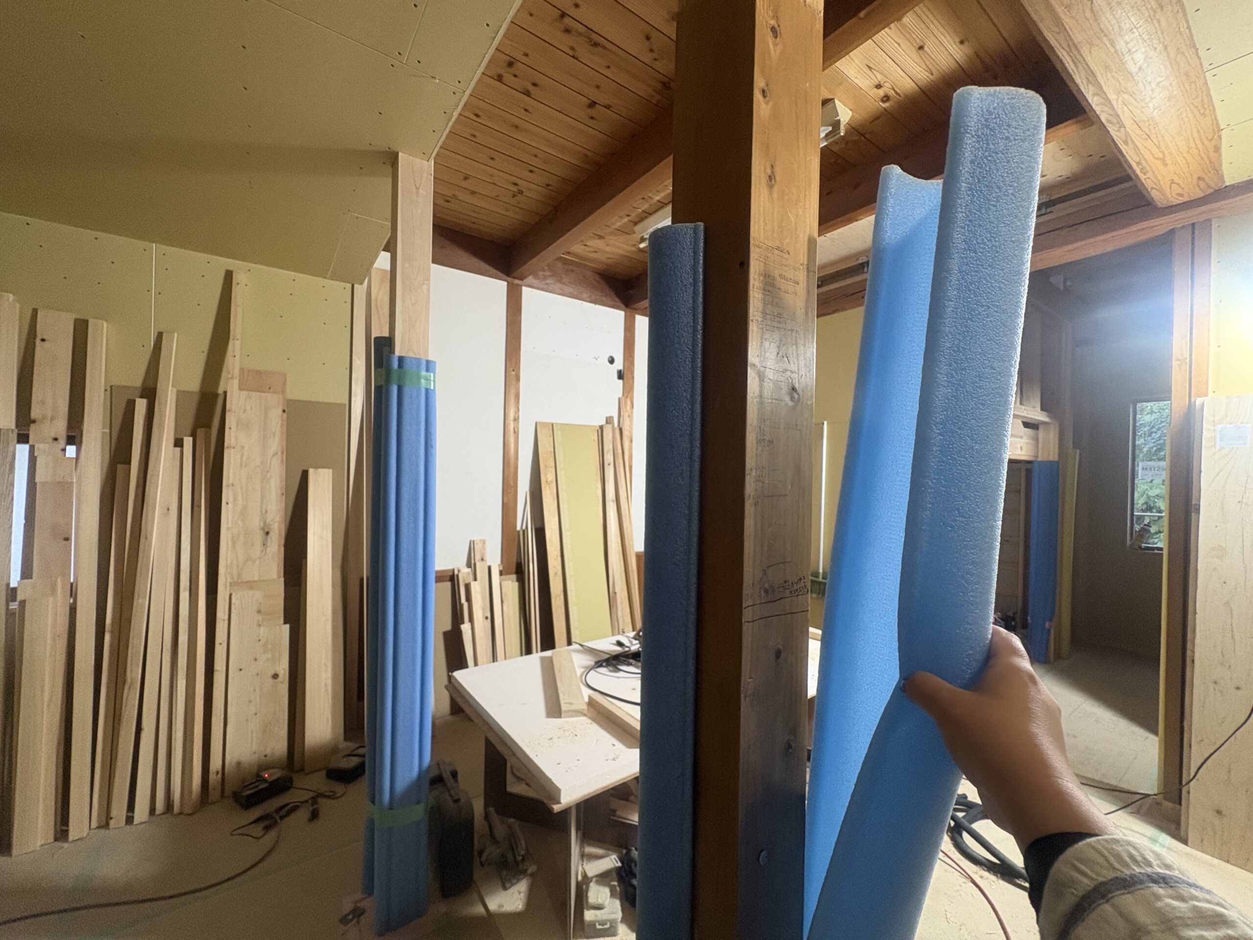 元々あった古い柱の横に新しい柱を設置した。リノベの場合は、よく見る光景ではある。元々の家の柱の位置・数・状態を基に新しいものを計画する。新しいものは、どんなものを何本、どのような状態で加えてあげるのか、細部にわたり検討する。