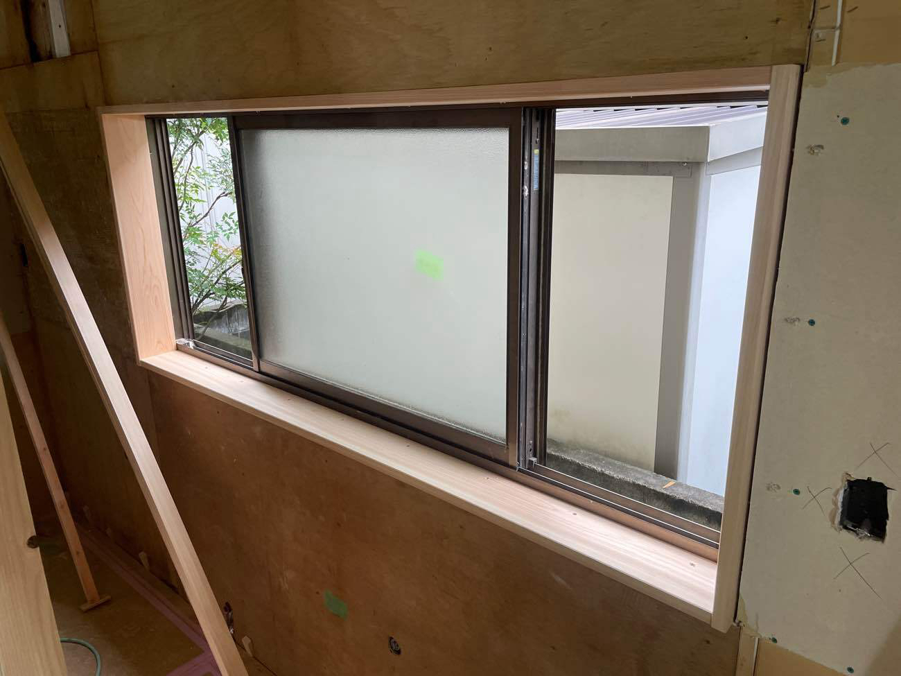 元々の窓に、新しい枠を設置しました。この後窓の工事に入りますが、この場所はカバー工法。窓(サッシ)も、カバー工法・インプラス・そもそも窓を取り替えるなどいくつか工法があります。