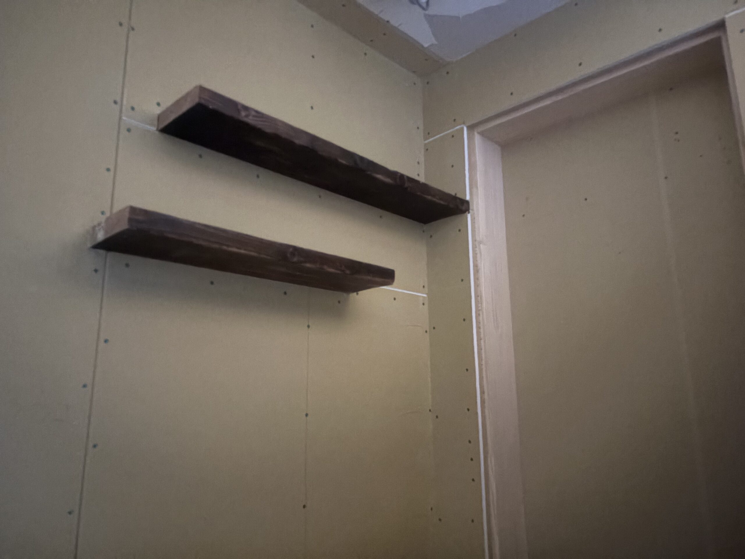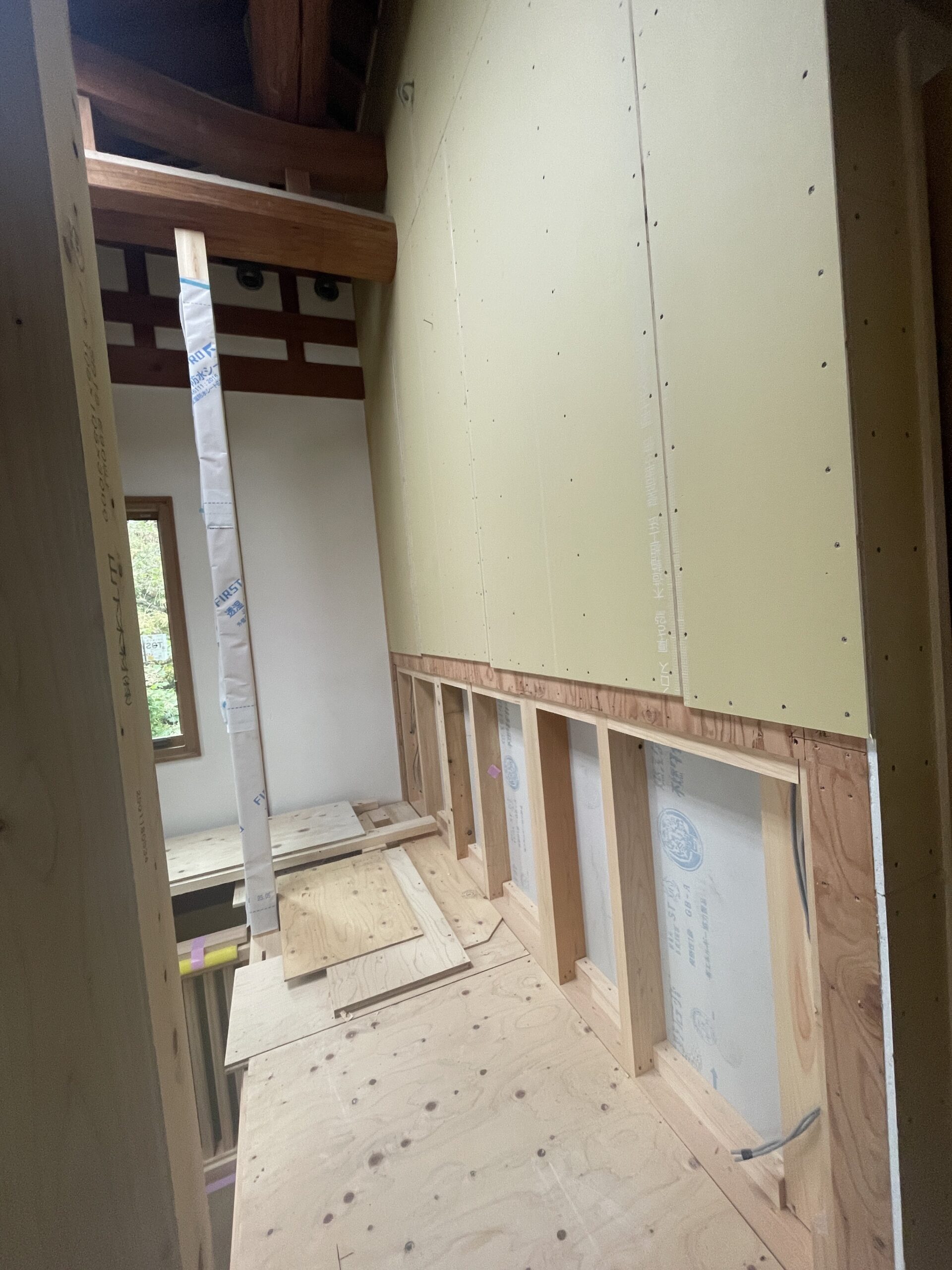 下地ボードを施工する前に、棚板の位置を決めて先に施工しておくことで、仕上げも綺麗になります。壁に何かを設置する際は、特に大きいもの、重たいものに関しては事前に位置を決めておくことをおススメします。