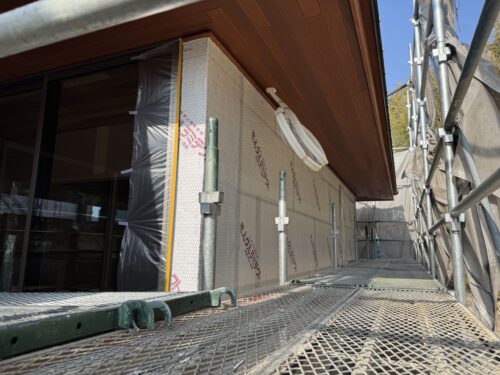 シートの施工とラス(写真で見える網)の施工、そして養生をします。