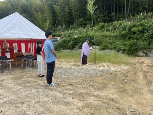 里山を迎える土間の家 新築 建築中 営業: 澤井 大輔 No. 2025年10月1日 地鎮祭をとり行いました 弊社でご契約していただいてから4か月、やっとここまでやってきました。これから工事が始まります。どんなお家ができるか楽しみです。