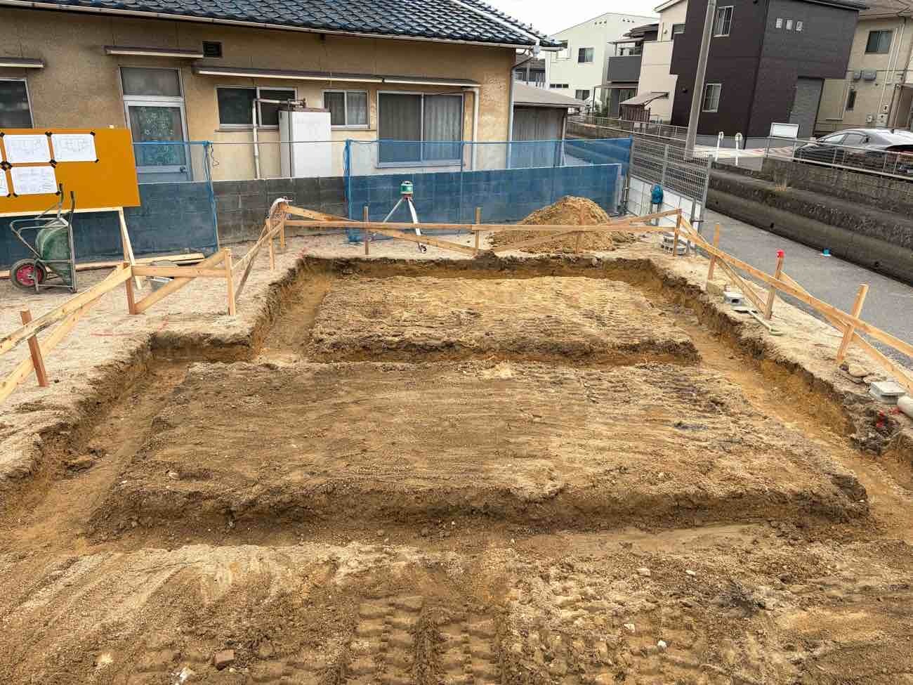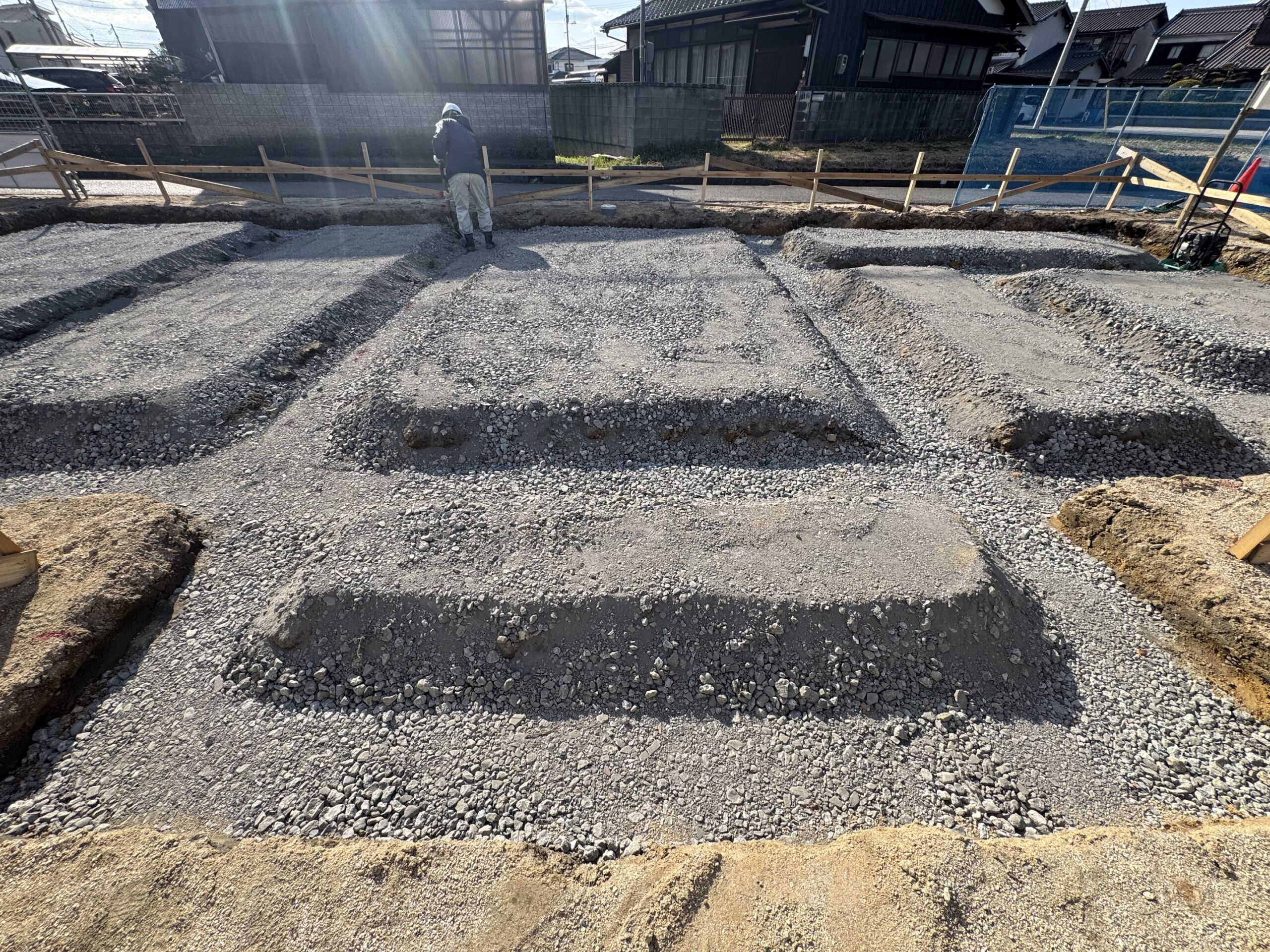 省空快居 新築 建築中 私たちが担当しています 営業: 澤井 大輔 設計: 横田 大介 工務: 東山 祐一朗 No. 2026年3月11日 砕石地業 建物を支える地盤の安定や、沈下を防ぐため、砕石を敷き詰めてしっかりと締め固める重要な作業です。 東山 祐一朗 No. 2026年3月10日 基礎工事始まりました 丁張で建物の位置を出したら、土を掘っていきます。 東山 祐一朗 No. 2026年2月11日 地鎮祭 これから始まります! 寒波で冷え込む朝。澄みきった冬空の下、地鎮祭を執り行いました。厳しい寒さの中でしたが、無事に工事の安全を祈願。ここから工事が始まります! 澤井 大輔