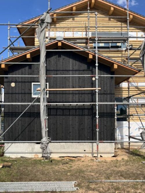 天気にも恵まれ大屋根の施工が終わりました。ルーフィングを貼ったので次はガルバリウム鋼板の板金屋根の施工です。