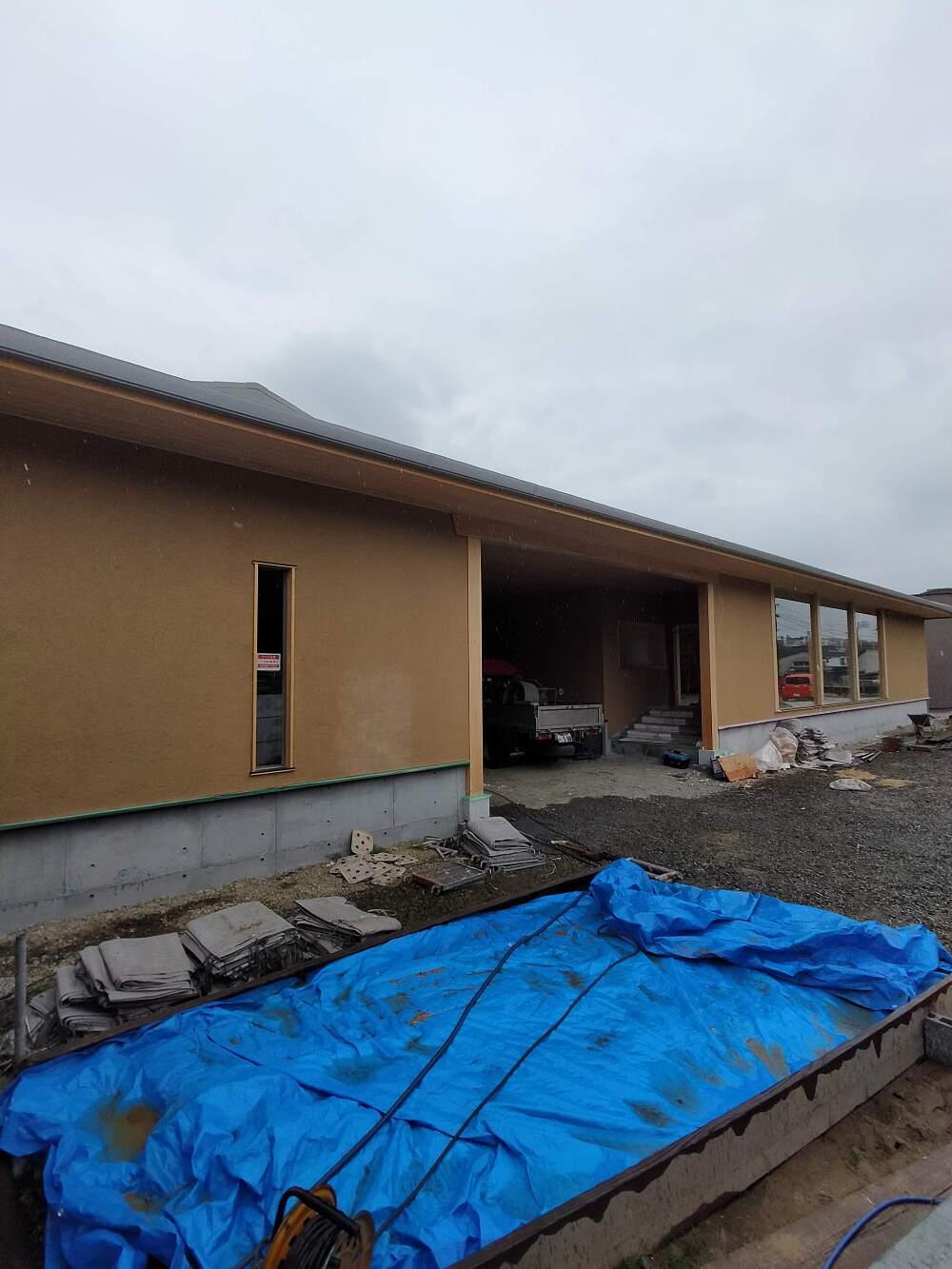 只今は屋根の下地が終わり瓦待ち状態で外壁の工事に取り掛かっています。