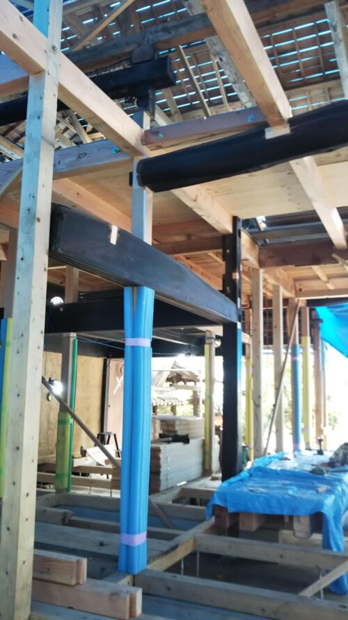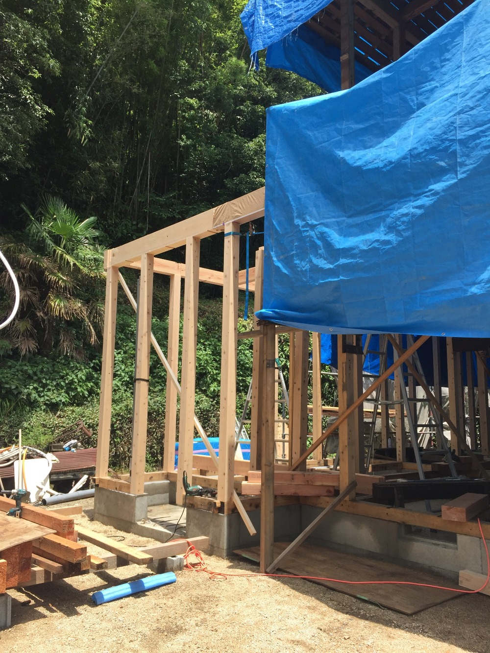 さて、本日は梅雨の合間の貴重な晴れ間で、このチャンスに滞っていた建方の続きで古い丸太に補強の梁を取り付けたり、新たに柱を立てたりと暑い中、大工衆ががんばってくれていました。