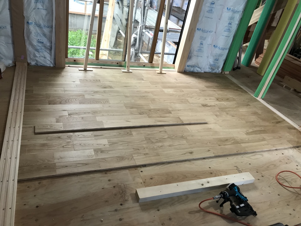 フローリングの材料が現場に届き、早速大工さんが仕事に取り掛かります。