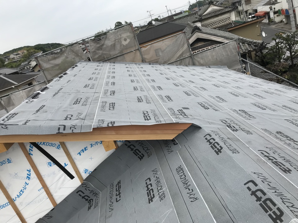 大工作業も完了し、大屋根にはルーフィングを敷きました。