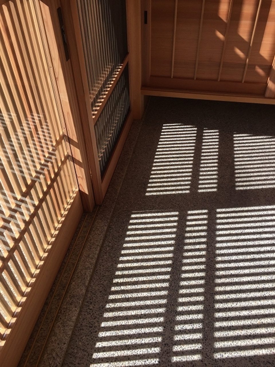 玄関は格子の木製建具。この日は天気が良かったので格子越しに差し込む光がやわらかく素敵でした。