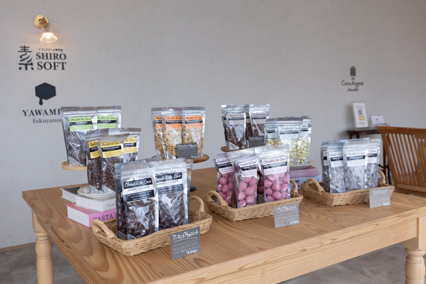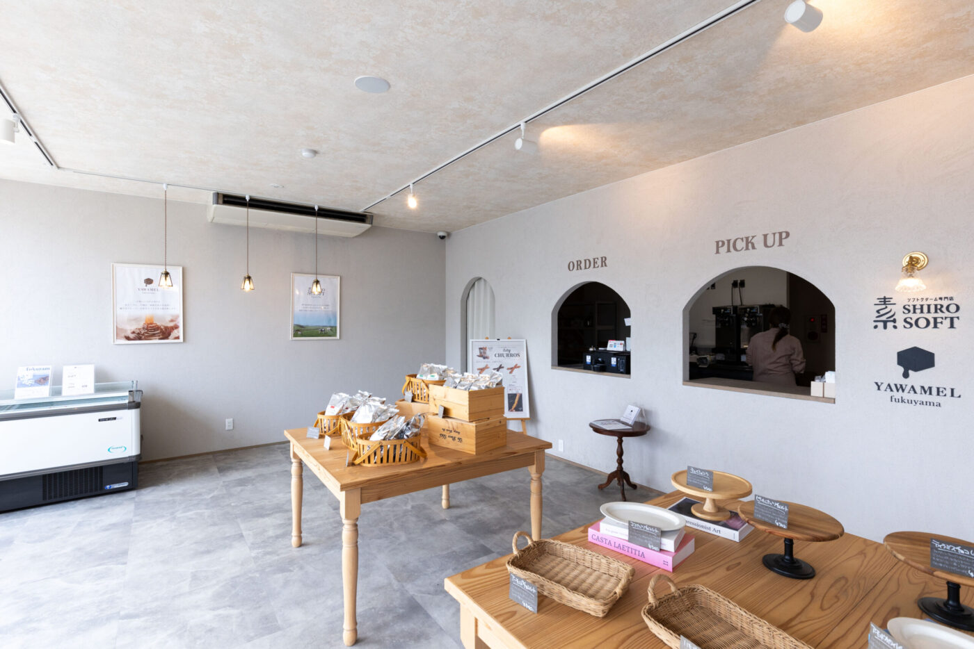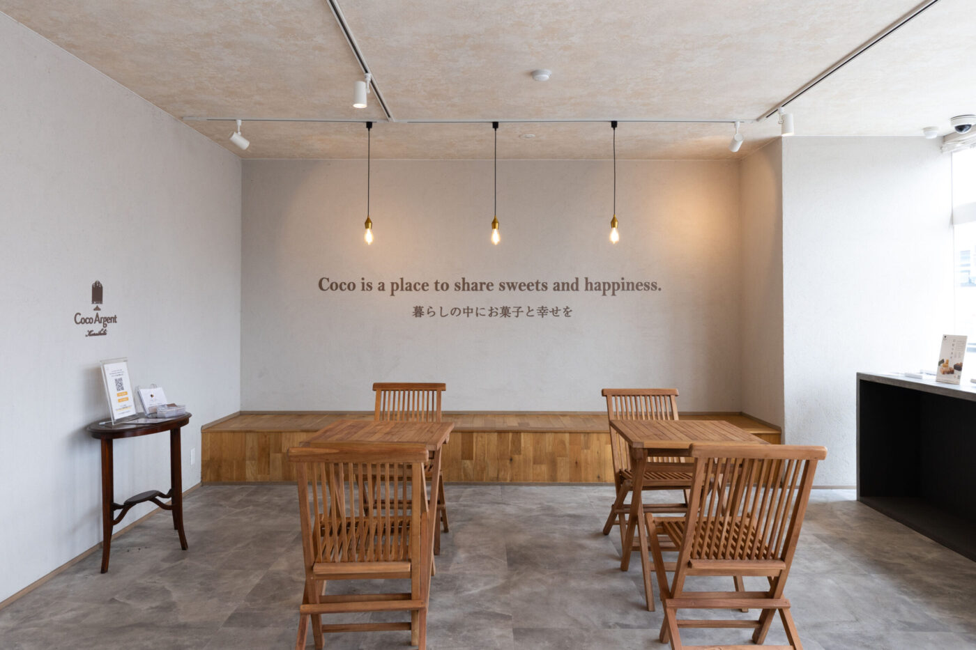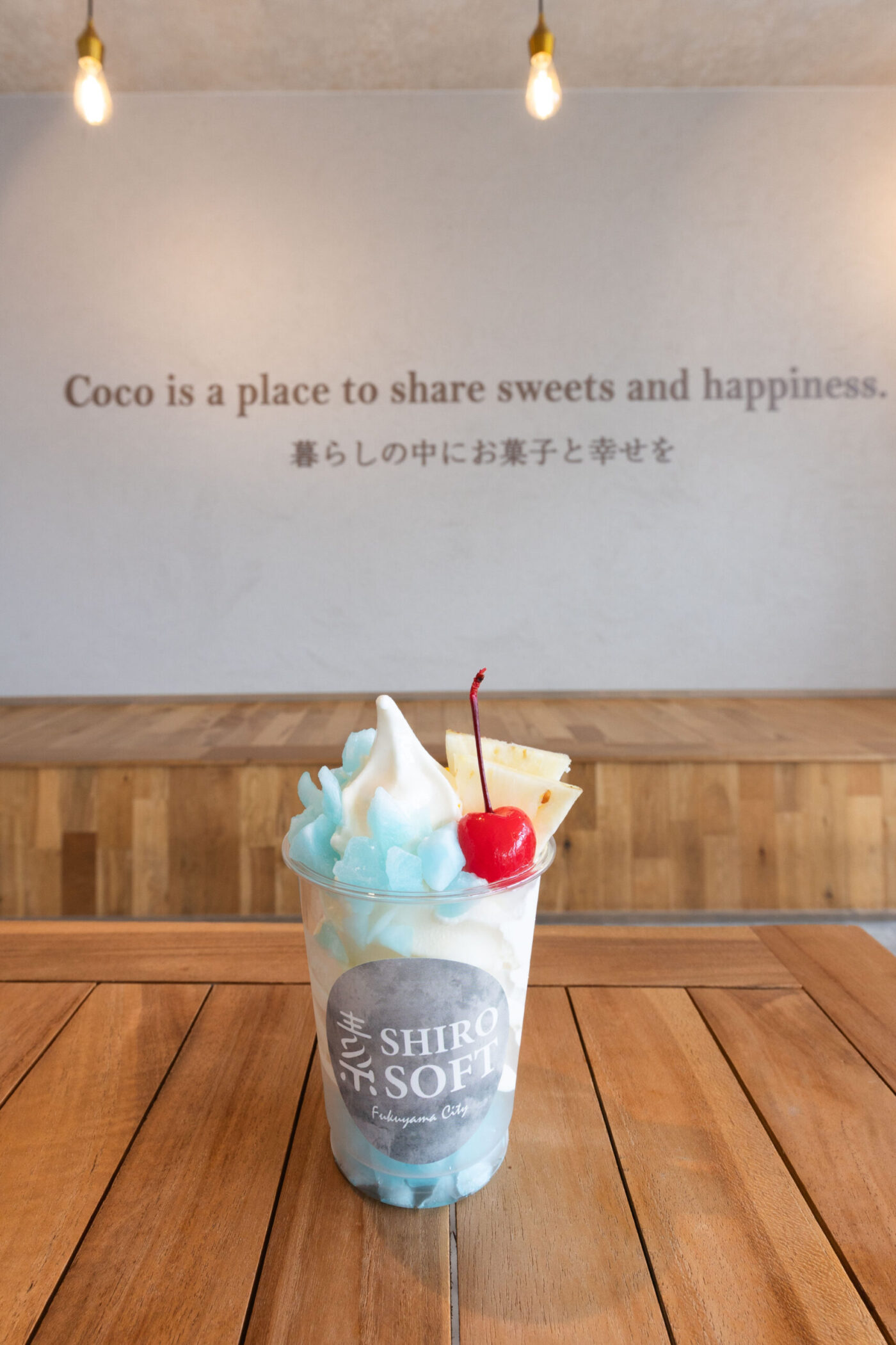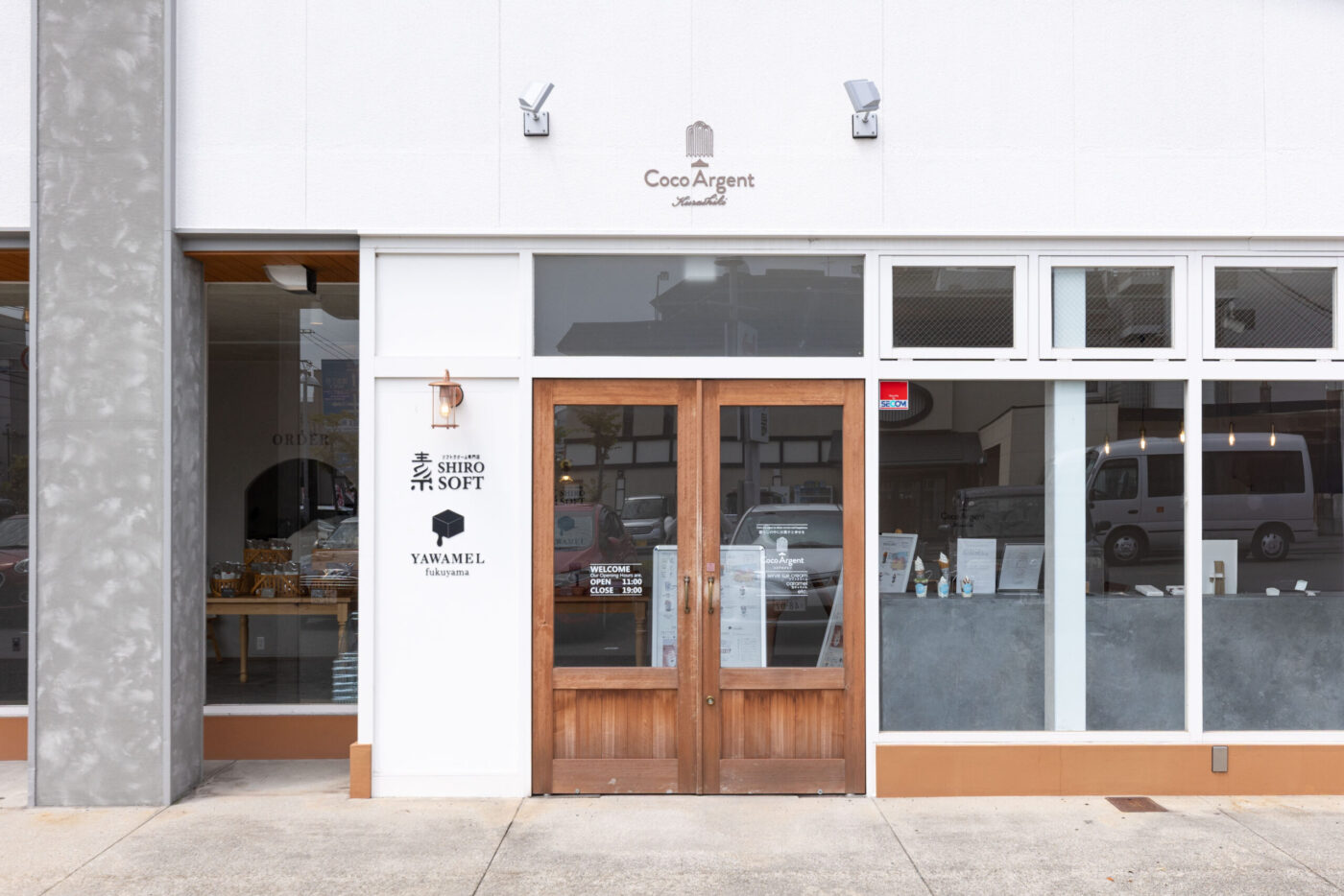 Coco Argent 倉敷は、ソフトクリーム、生キャラメル、チュロスなどのスイーツが1か所で食べられるスイーツセレクトショップです。外観や店内は白を基調とし、ライトや木製のドアは、 SNS映えするおしゃれな空間を意識しています。
