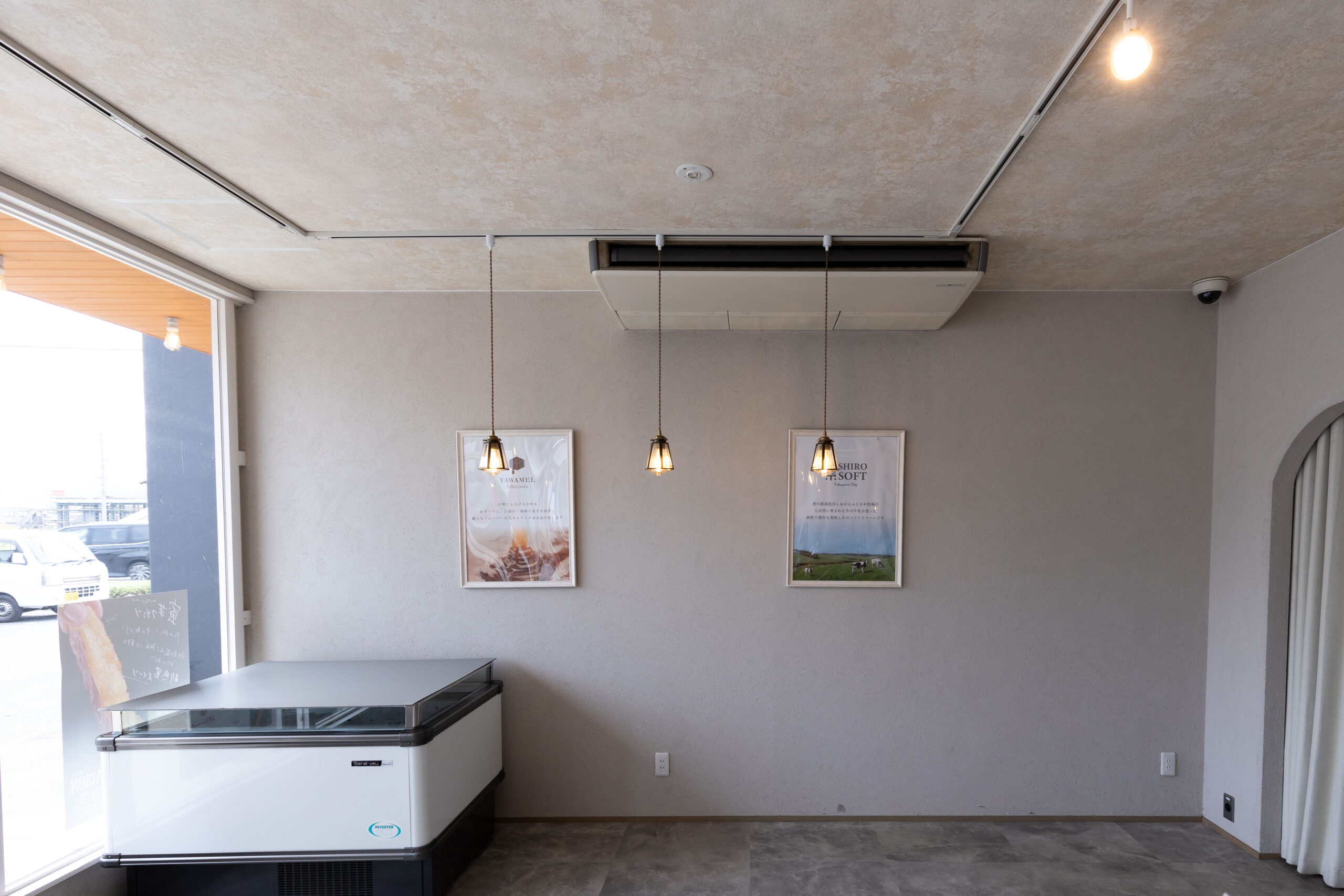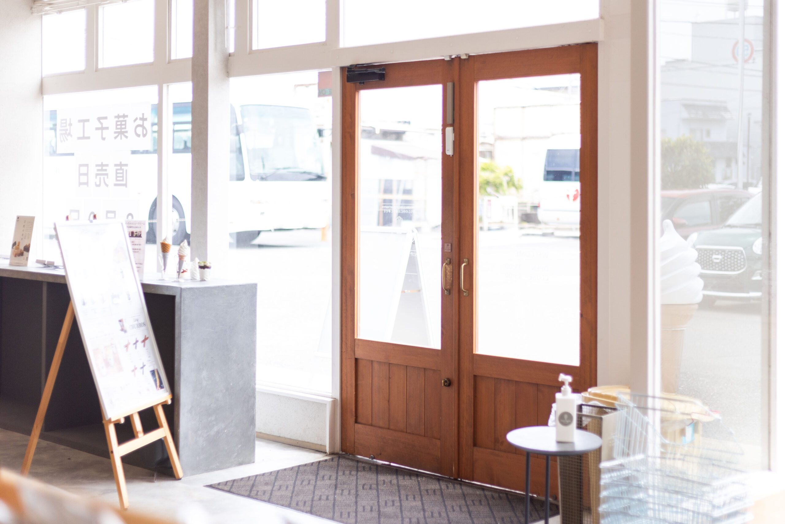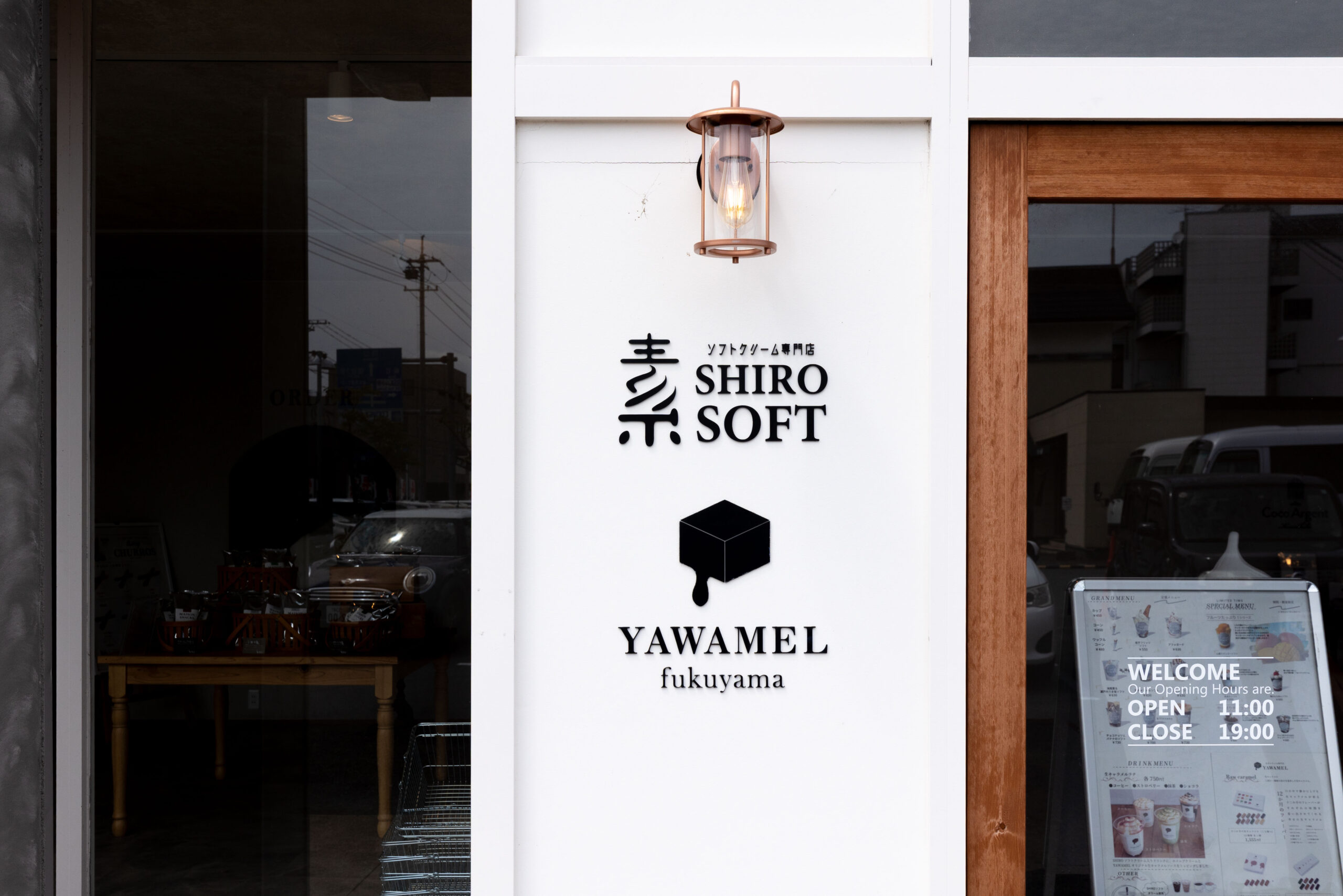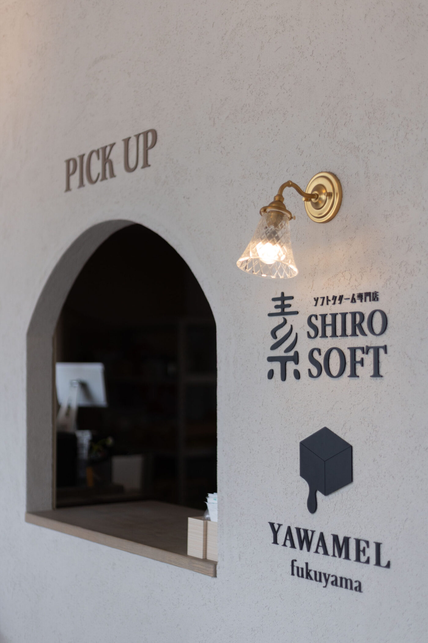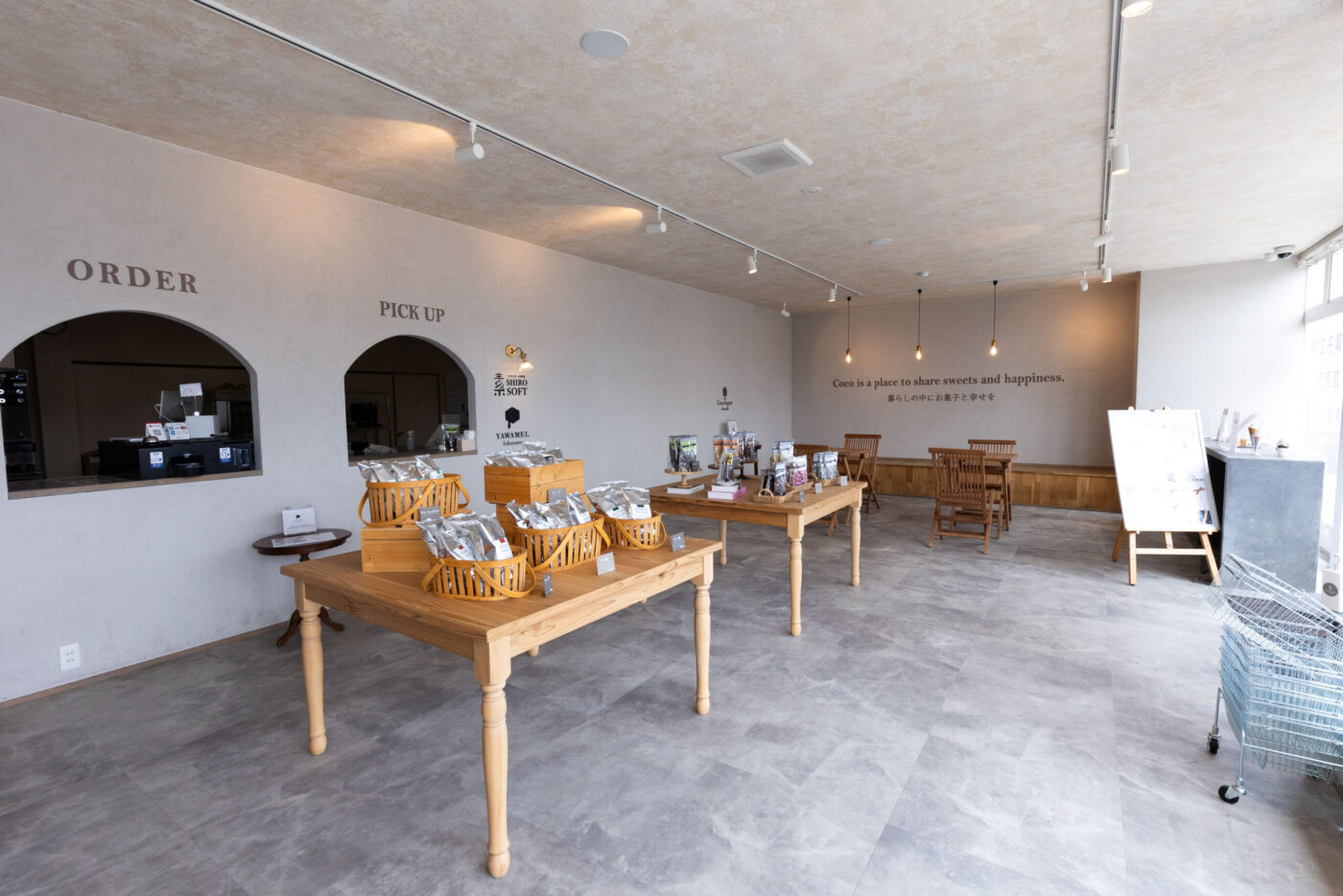 Coco Argent 倉敷は、ソフトクリーム、生キャラメル、チュロスなどのスイーツが1か所で食べられるスイーツセレクトショップです。外観や店内は白を基調とし、ライトや木製のドアは、 SNS映えするおしゃれな空間を意識しています。