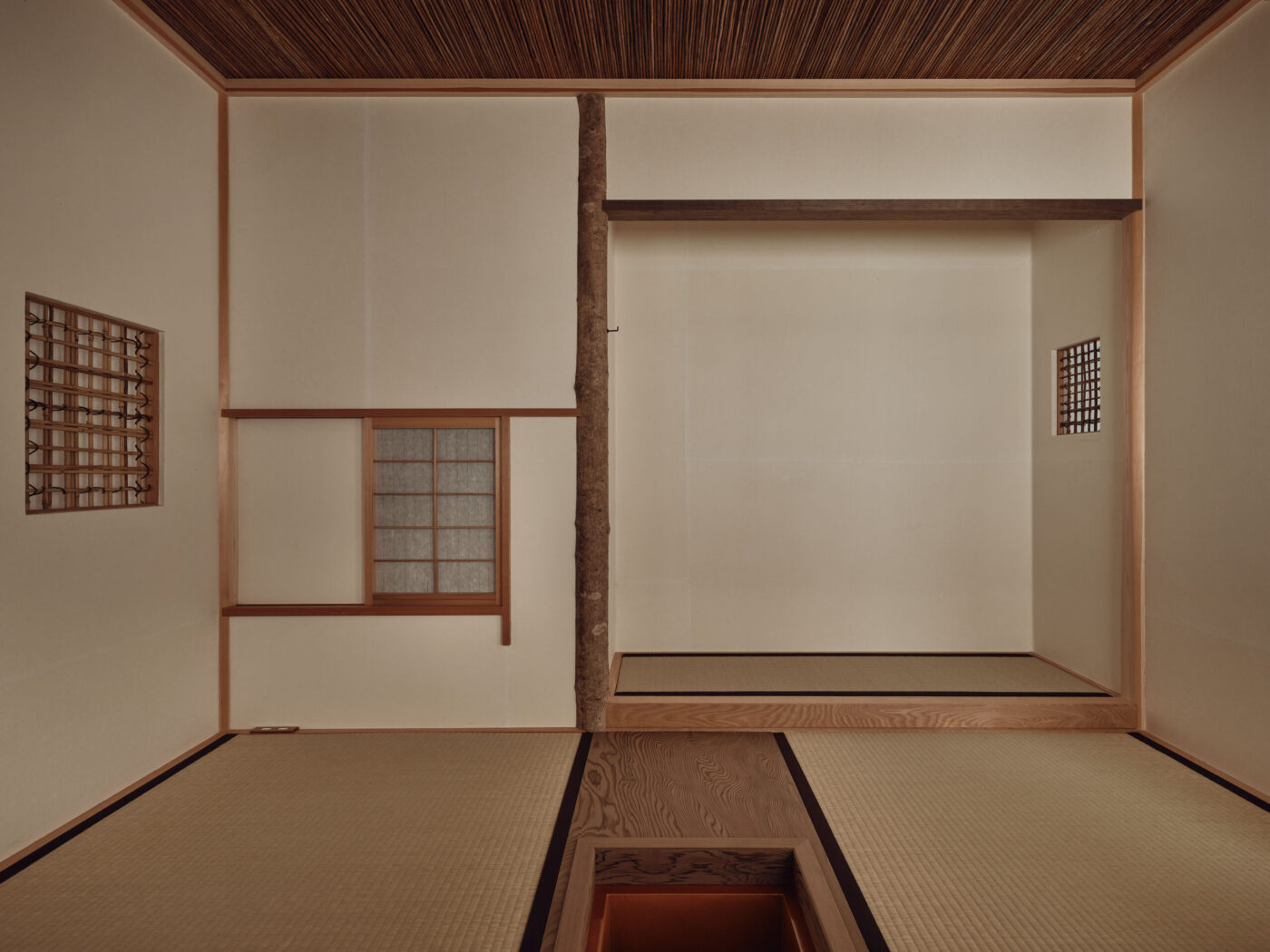 この二畳中板の茶室は、朝と夕、それぞれの時間帯の自然光を最も美しく取り込むため、位置を変えられる構造を採用。