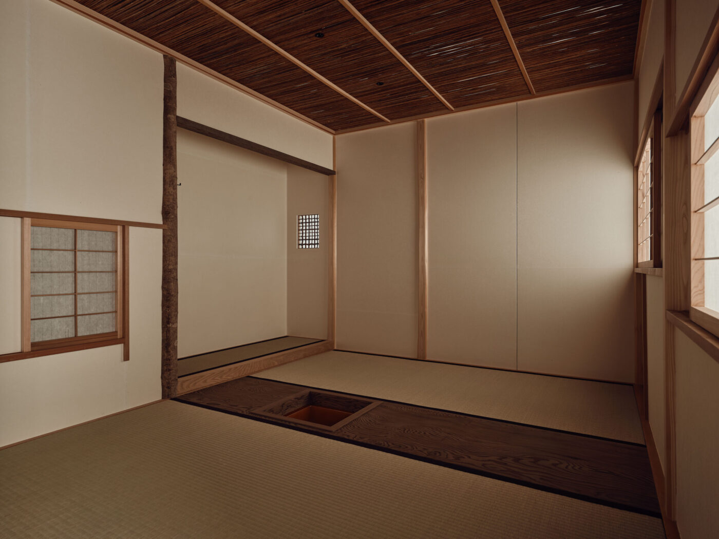 ※本施工事例では、室内全体や立礼式コーナーを含む空間デザインのうち、二畳中板茶室の造作・素材選定・納まりを担当しています。