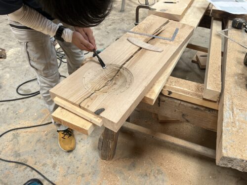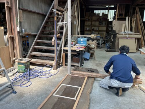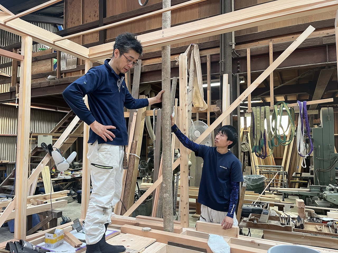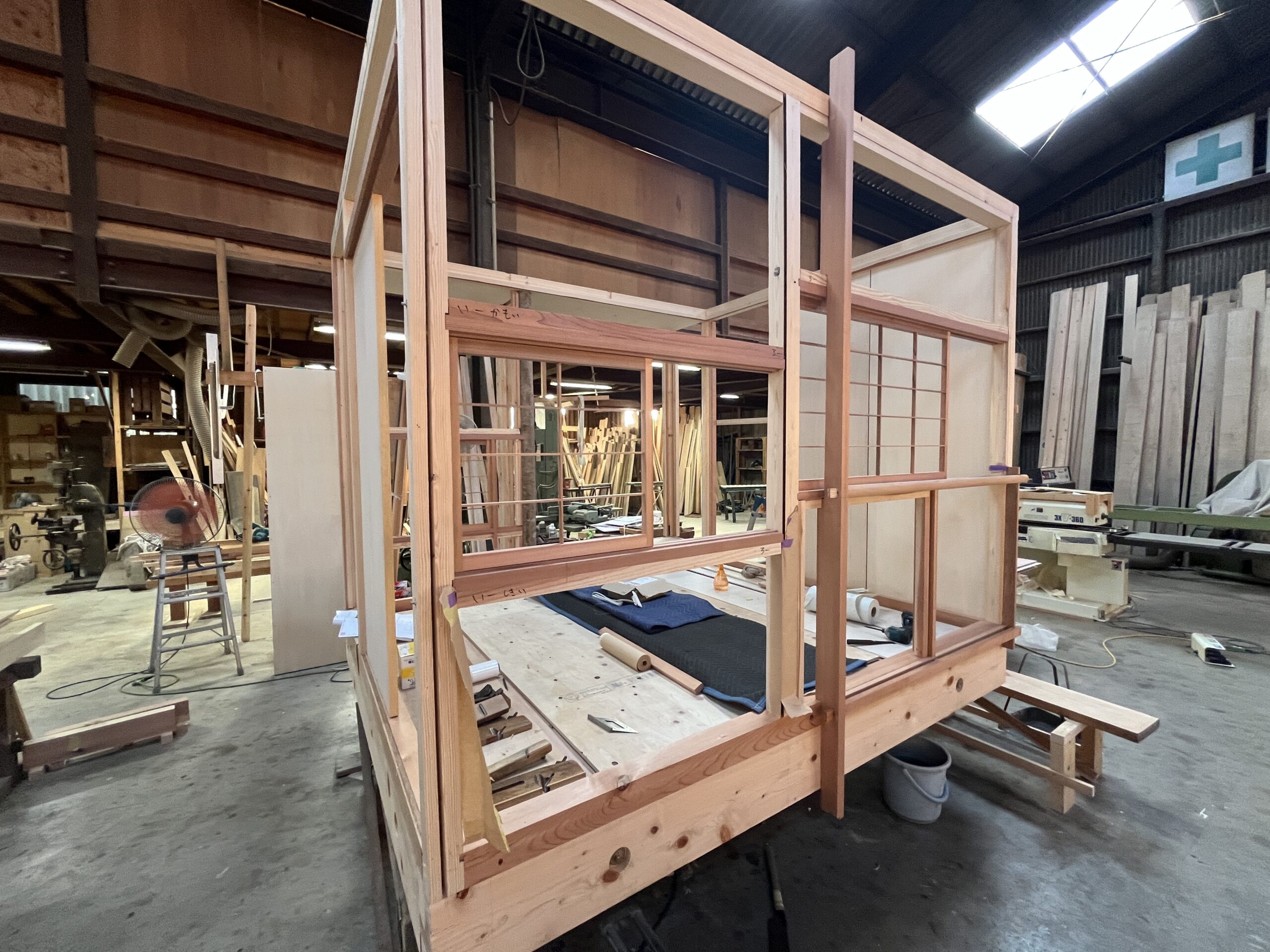 茶室は、なんば建築工房の工場にて、ベテランと若手の大工が約二か月にわたり制作した。
