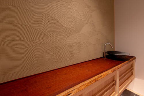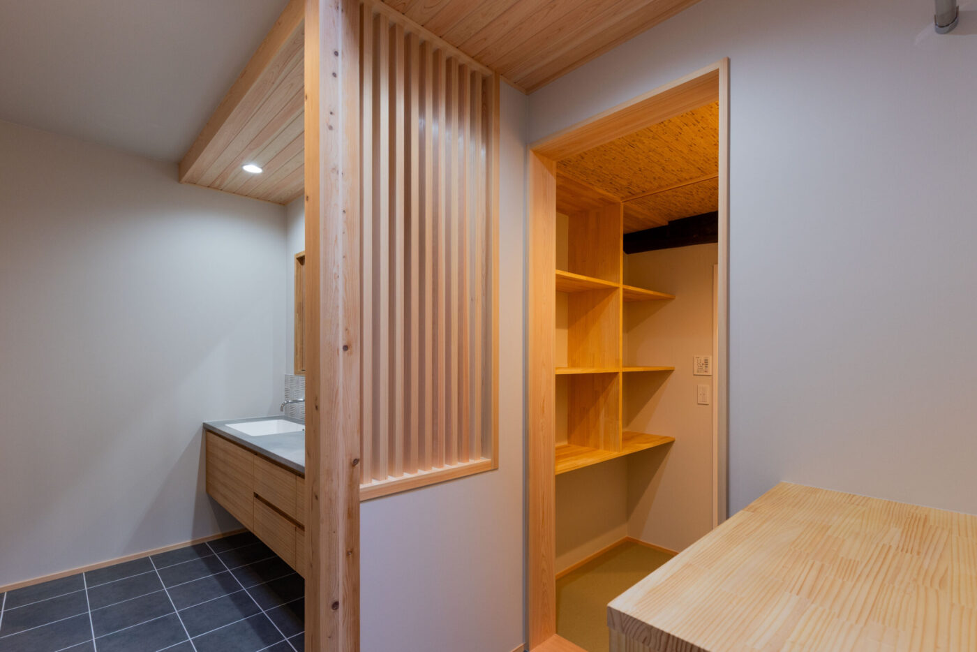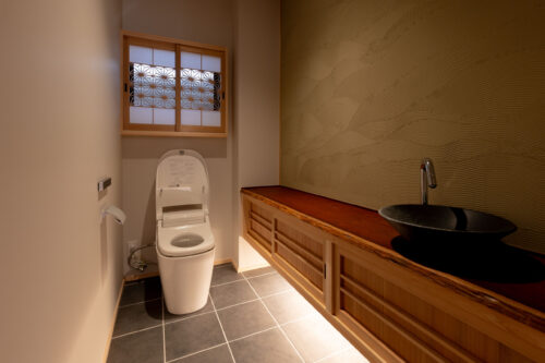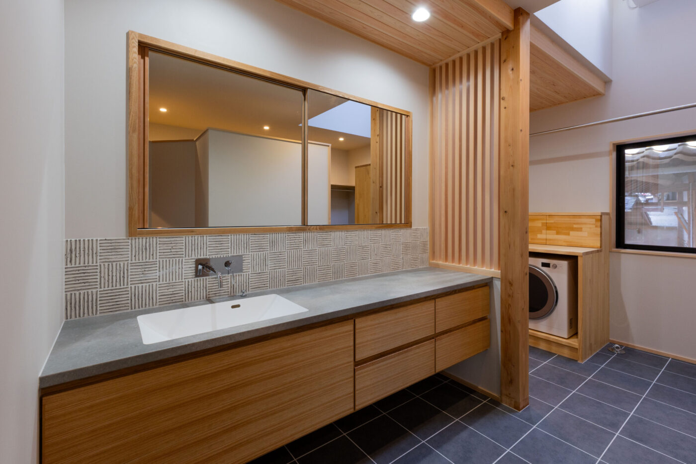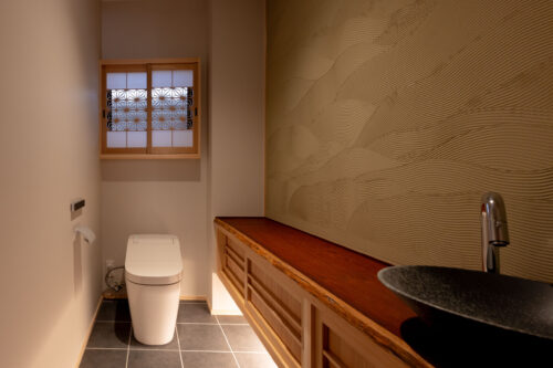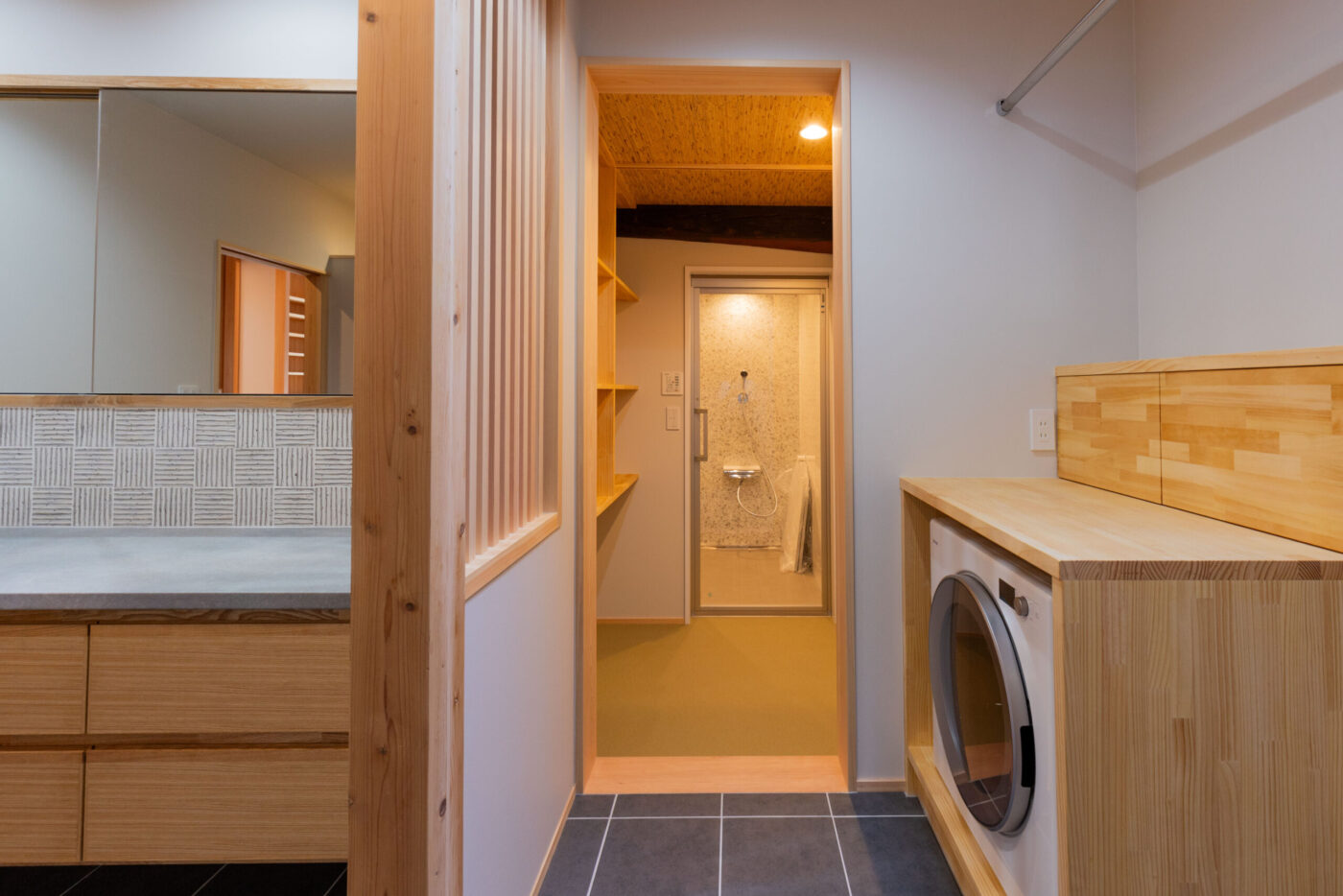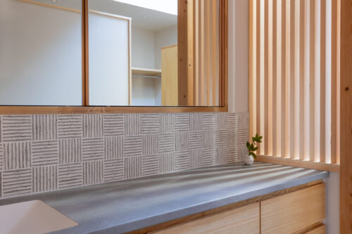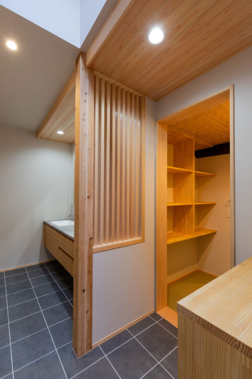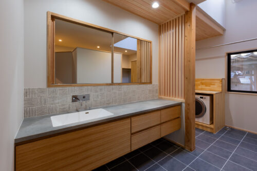 木製の格子デザインをあちこちに散りばめ、また銭湯風の充実した洗面脱衣スペースなど、住まい手のこだわりを随所に取り入れながら、快適さと居心地のよさを高めています。