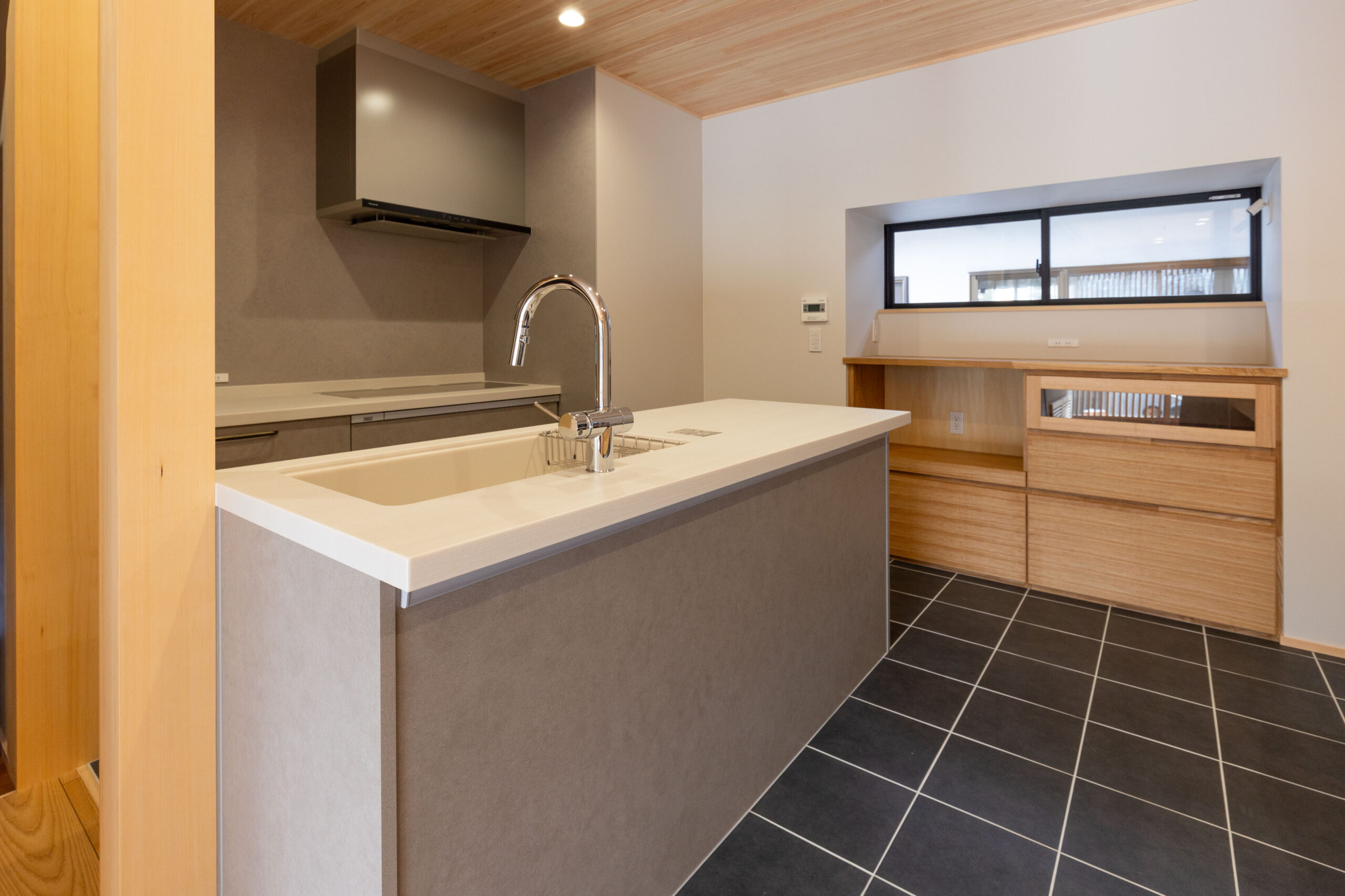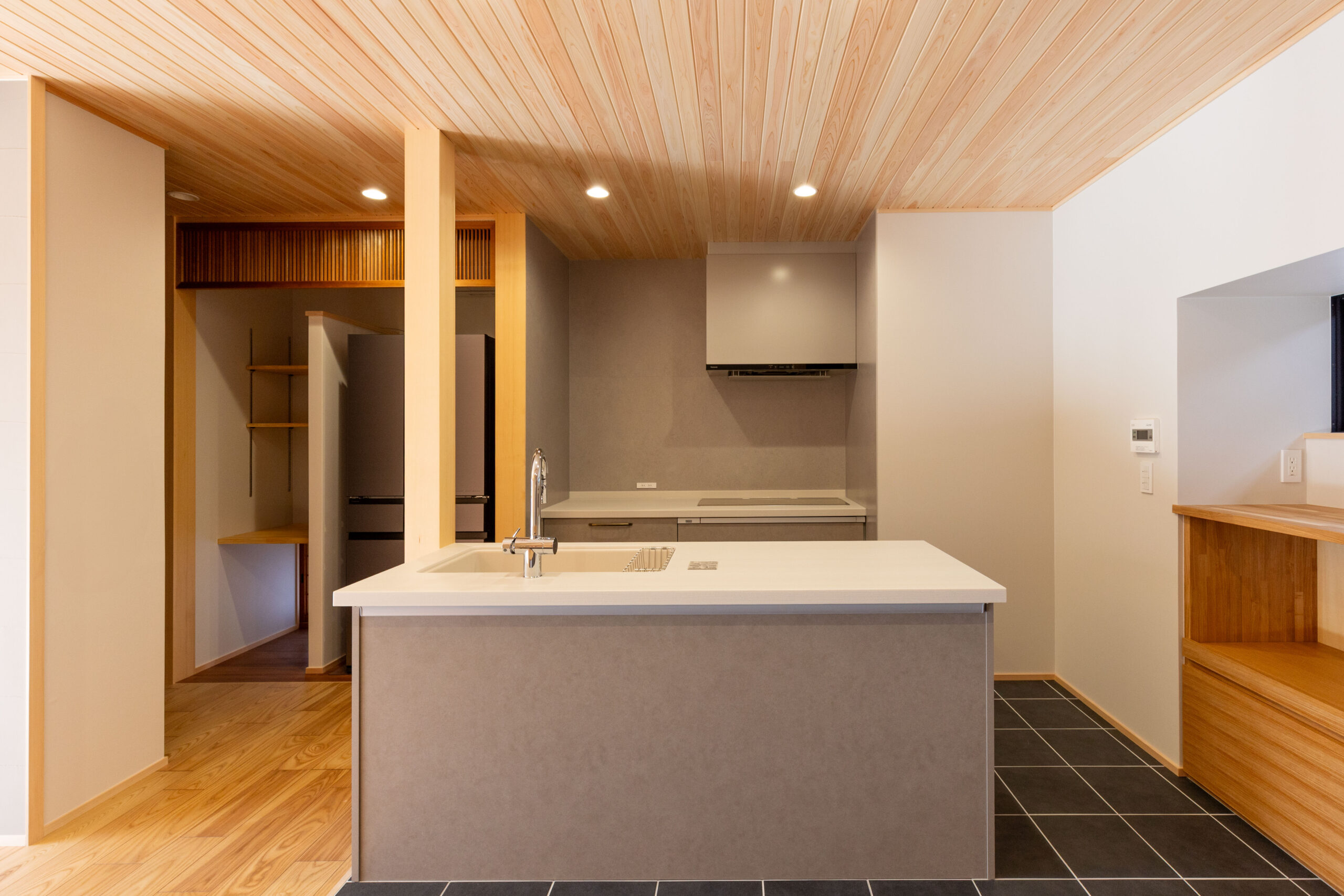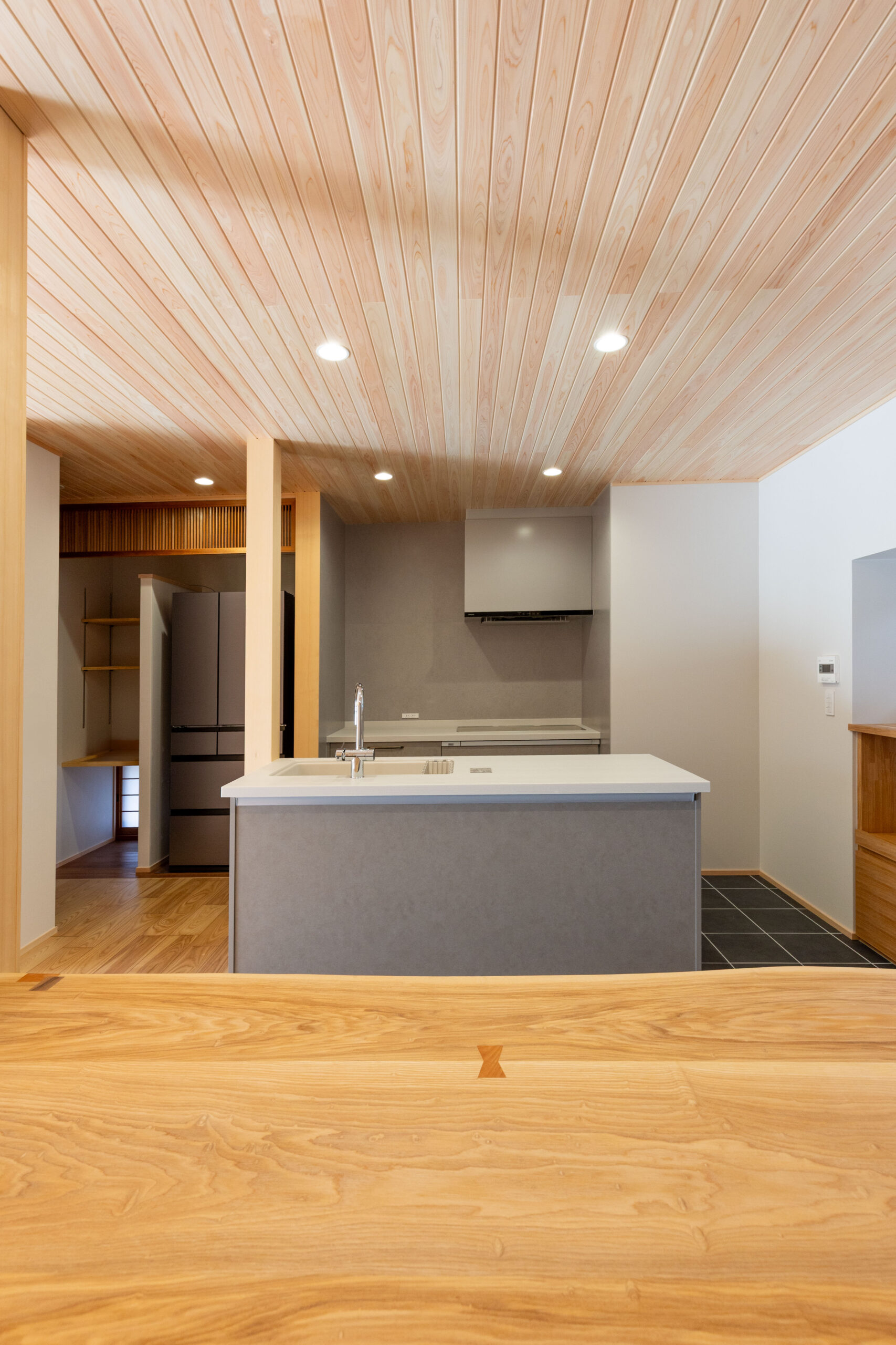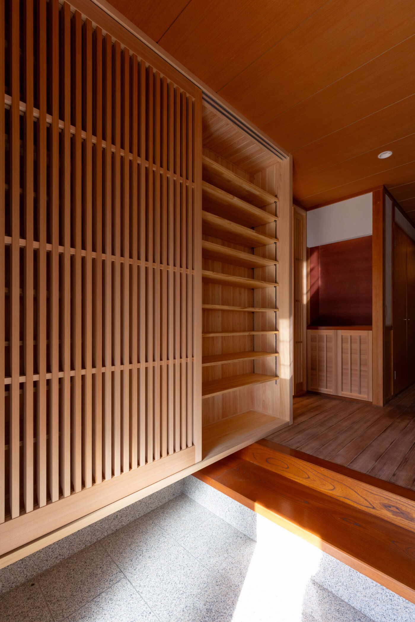 木製の格子デザインをあちこちに散りばめ、また銭湯風の充実した洗面脱衣スペースなど、住まい手のこだわりを随所に取り入れながら、快適さと居心地のよさを高めています。