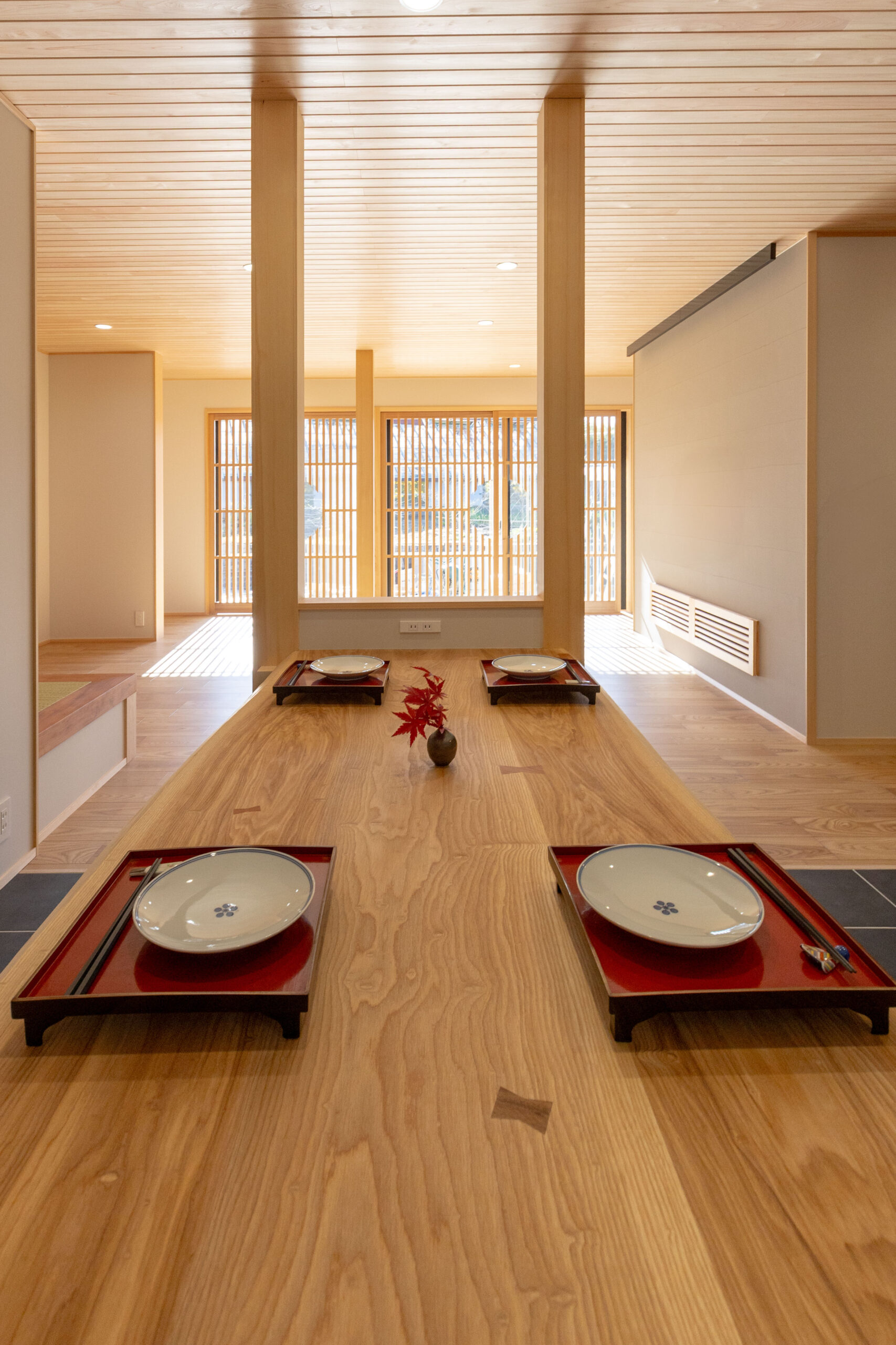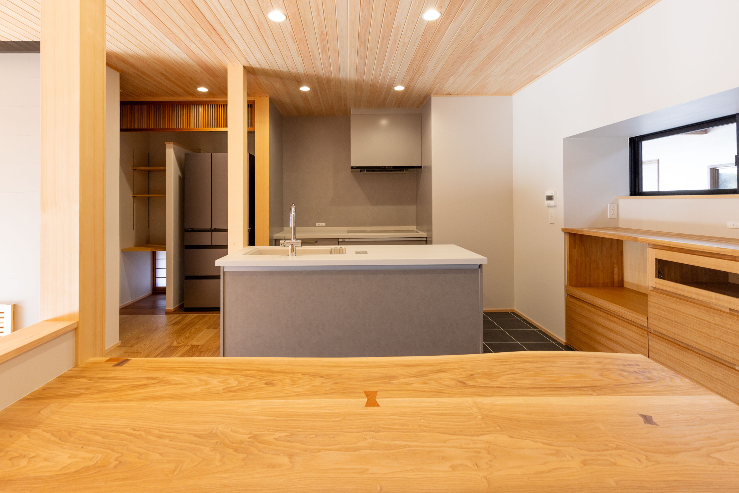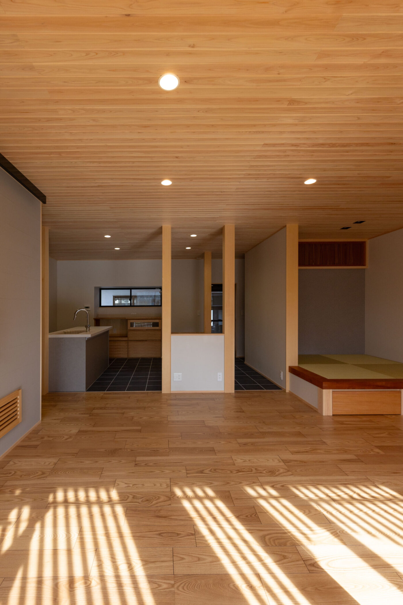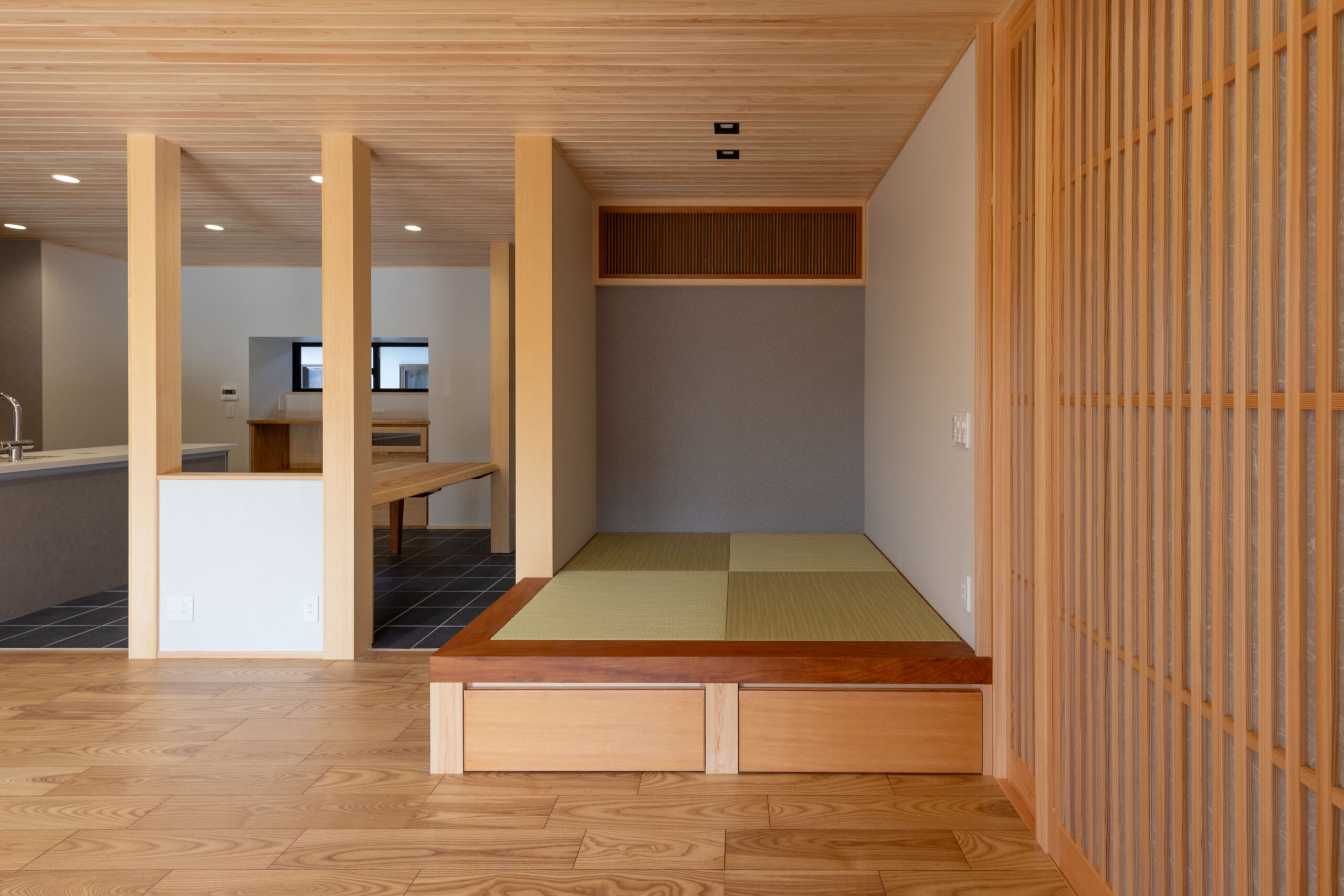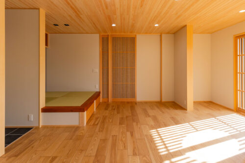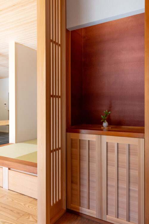 小上がりの畳コーナーの框にはなんばの豊富なストック材からサクラをセレクト。