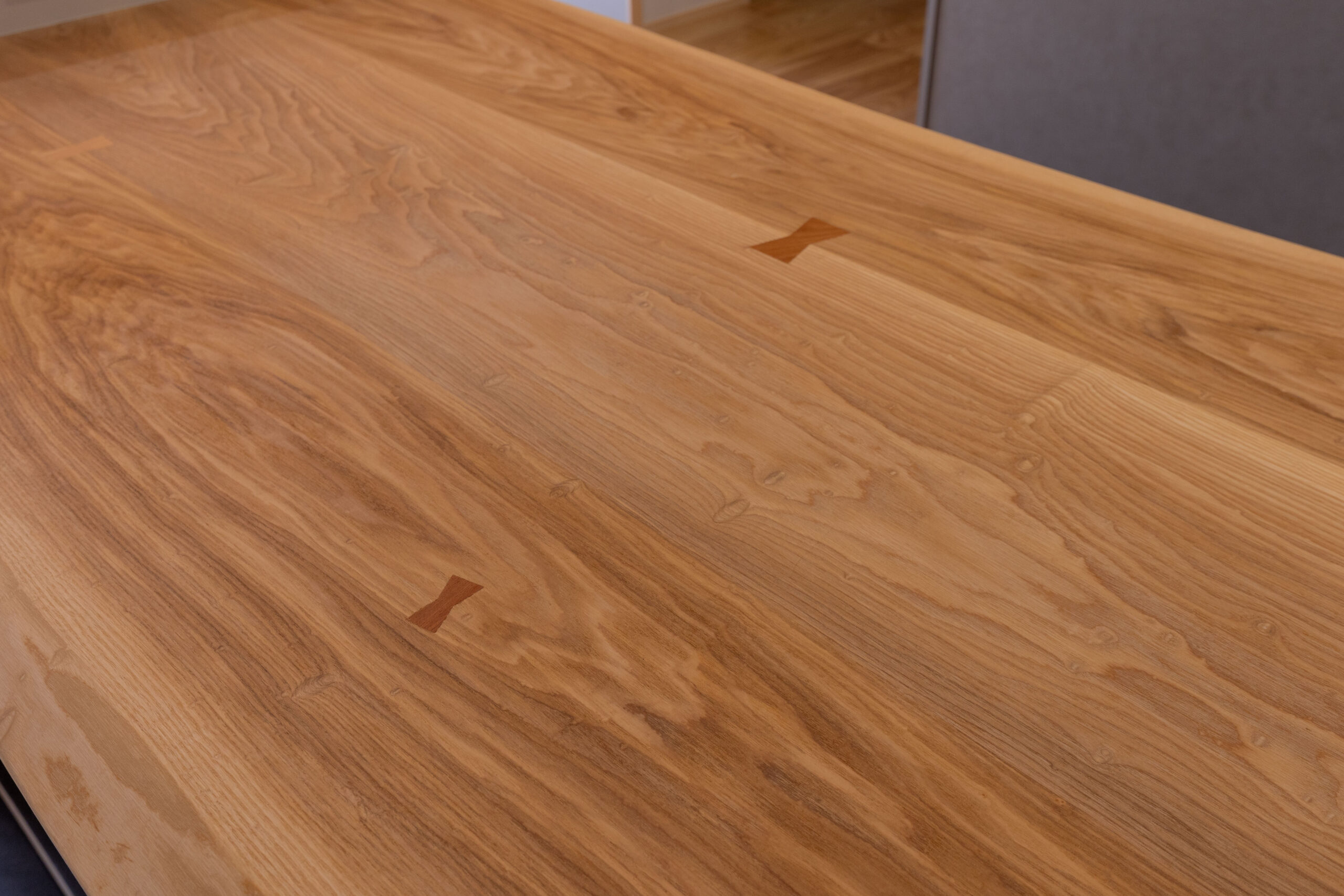 タモ材のダイニングテーブルは、大工の手仕事による一点もの。