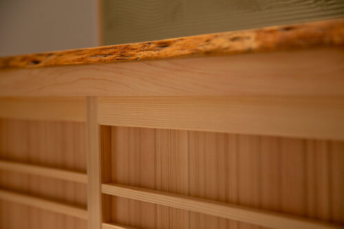 割れや反りを抑えるために木片をはめ込む伝統的な技法である「千切り」を今回はお施主様のご要望により意匠として施した。