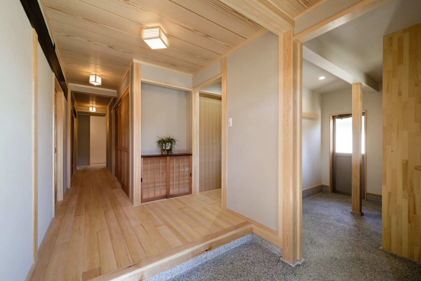玄関から続く長い廊下は昔の名残の大きな梁が。