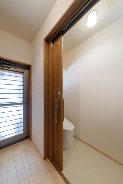 洗面所は廊下の一部に設け、鏡や収納も目的に合わせて造作した。