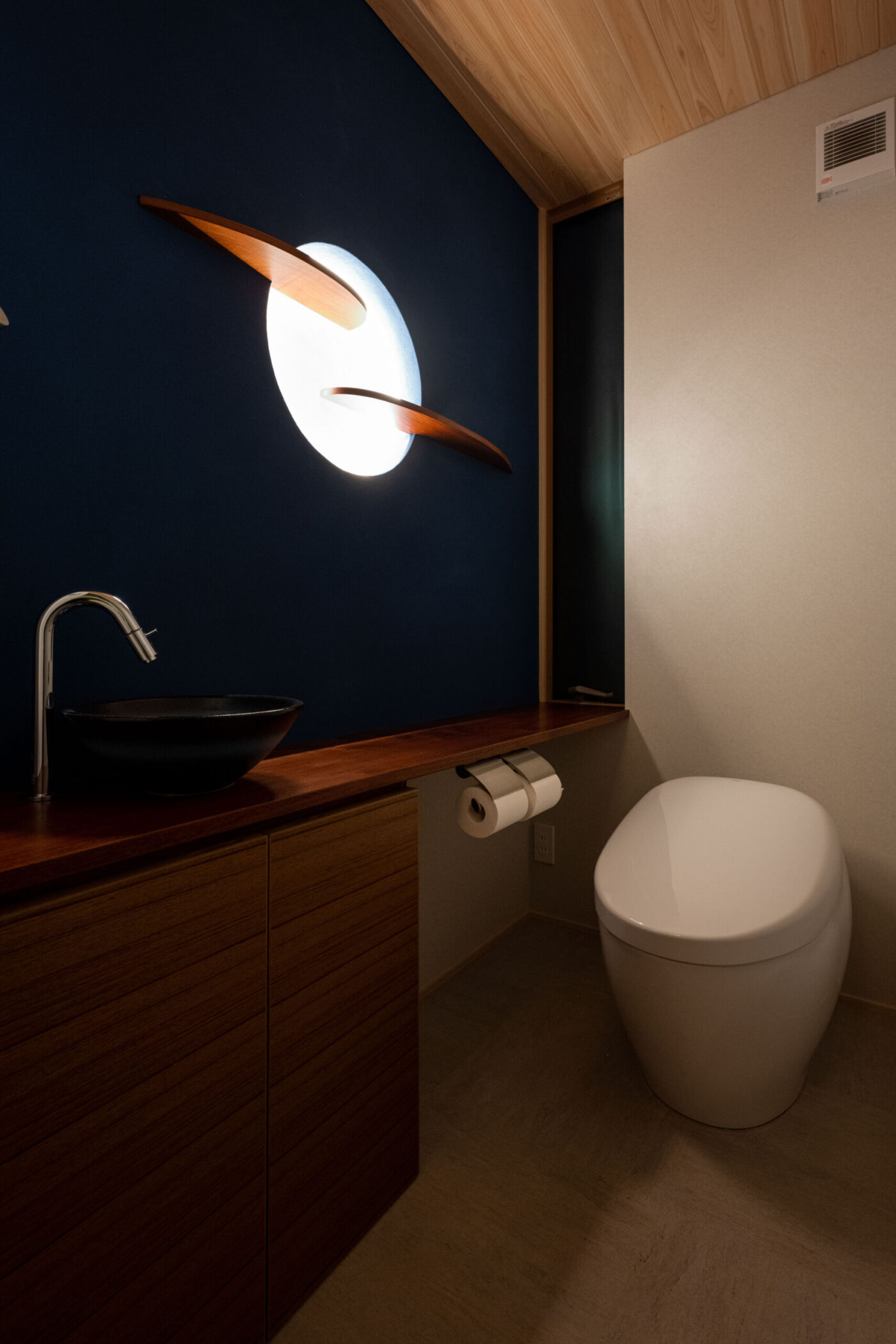 引き出し内部にドライヤー用のコンセントを設置、三面鏡を既成品とすることで使い勝手を優先させている。