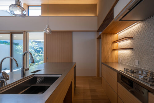 造作することで住人と建築空間のスケールに合わせることができ、レンジフードや設備機器を建築に組み込むことで、空間を圧迫することなく整然と納まっている。