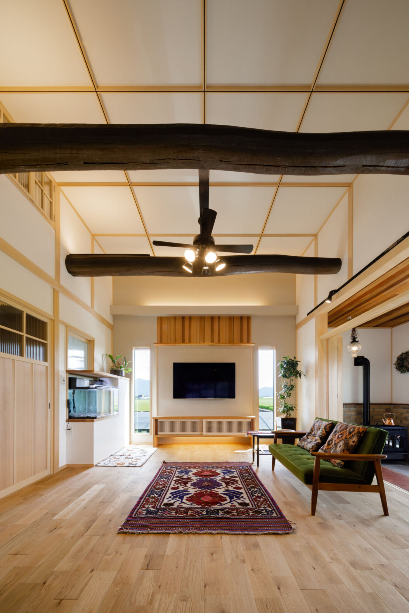 吹き抜けに取り付けた丸太は、工事中に偶然手に入った、別の現場の古材を再利用したもの。