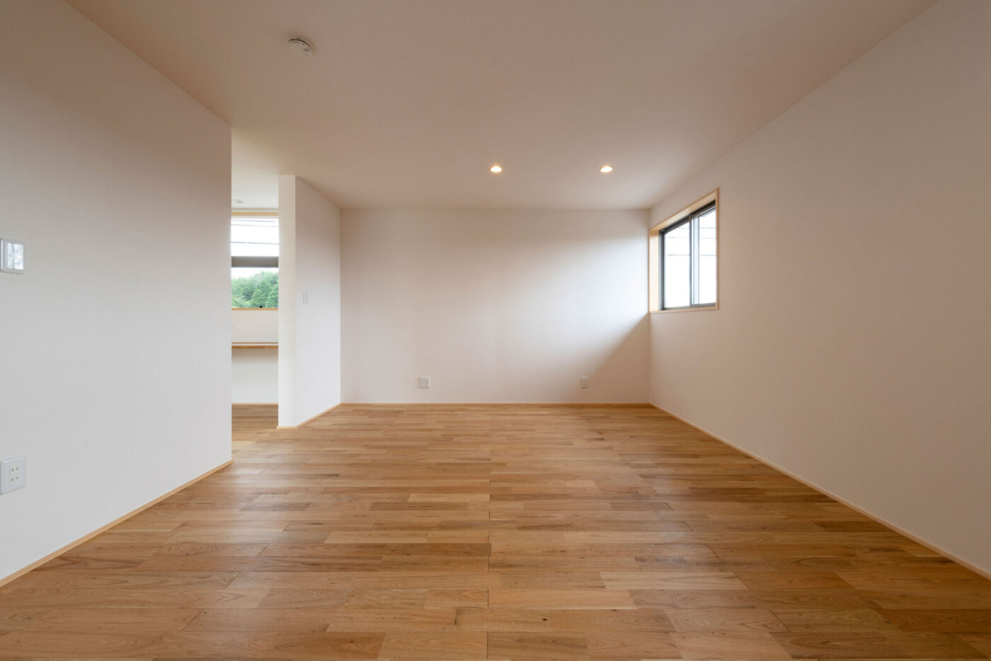 扉横の造作のFIX窓からは優しく光が入り、仕上が外部までのびて空間に広がりを与えている。