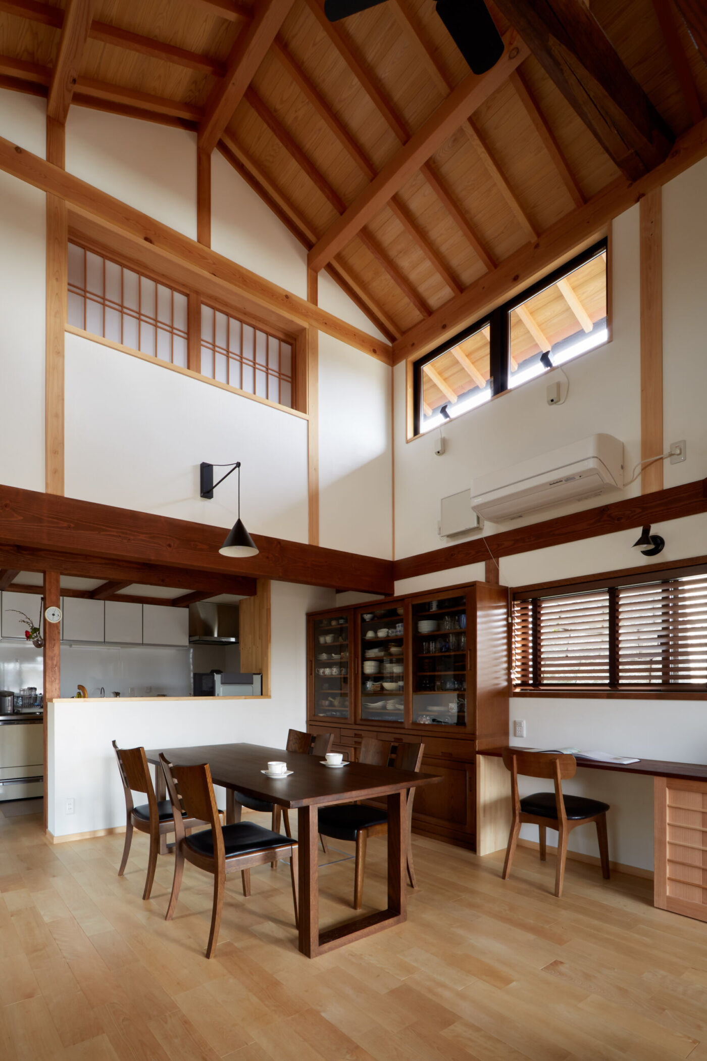 ダイニング上の吹き抜けには、二階の個室と繋がる障子の窓が。