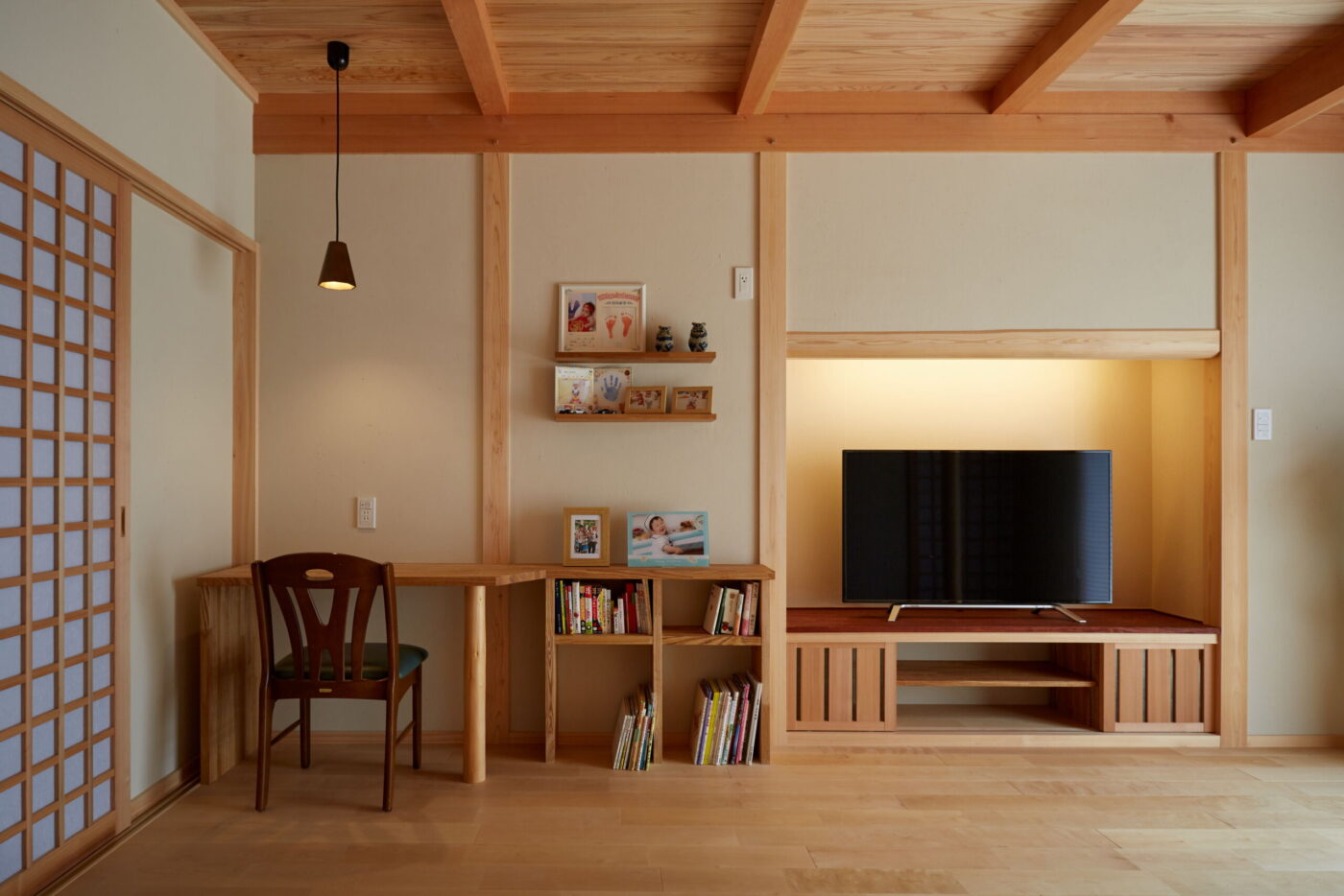 さらに、2階には構造的に撤去できない既存の梁を残す事で、古民家の雰囲気を味わえる趣味のお部屋を新しく作りました。