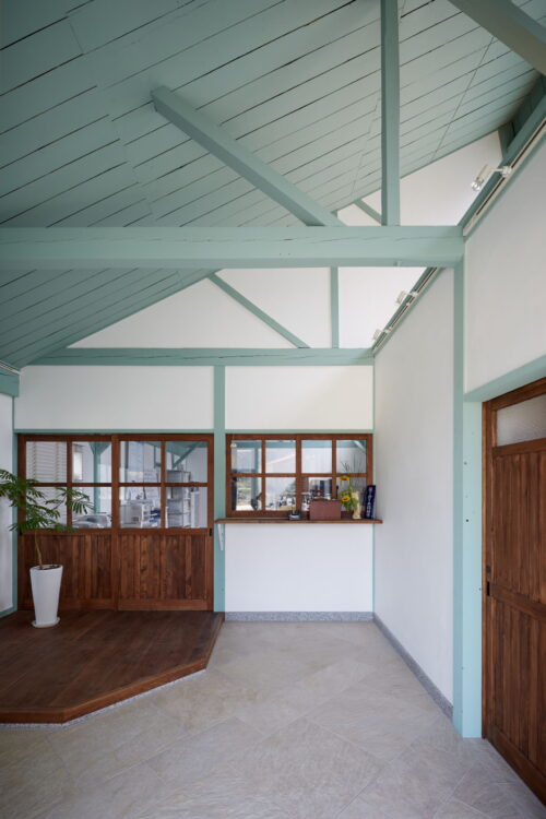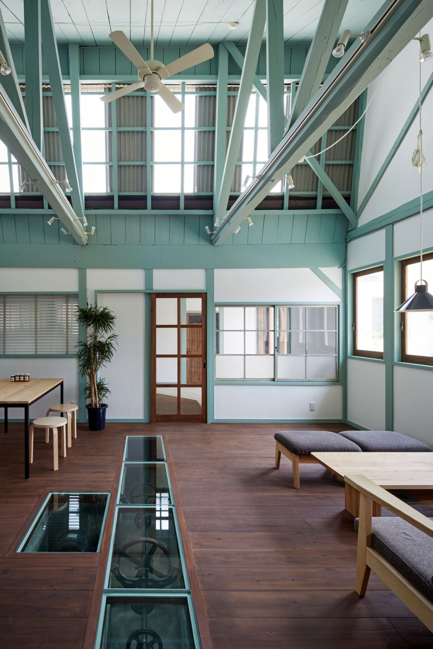 既存の淡い緑のペンキ塗りの空間がなんともレトロ。