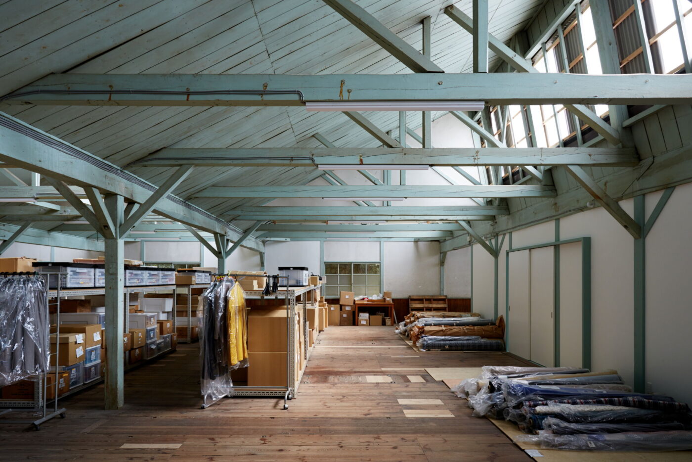 工場内部。のこぎり屋根からの側面採光で明るい内部空間。
