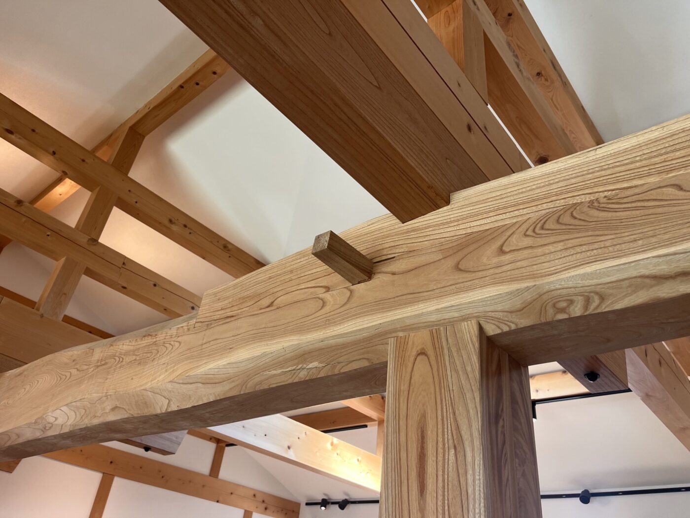 弊社では、丸太梁の扱いに経験豊富な設計士が図面に反映し、現場では棟梁の指揮のもと、安全かつ丁寧に設置します。