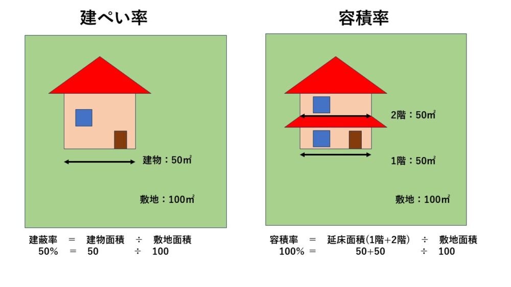 例えば2階建を建築予定で容積率が100%の土地(敷地100㎡)なら、1階、2階のすべての階の床面積の合計が100㎡までは建てられます。