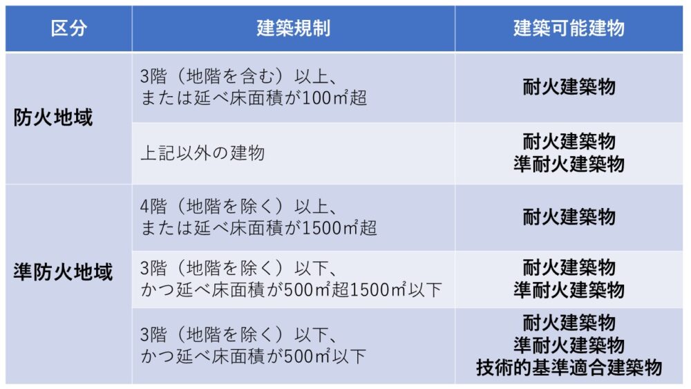 防火地域や準防火地域では、地階や延べ面積で建てることができる建築物が決めらています。