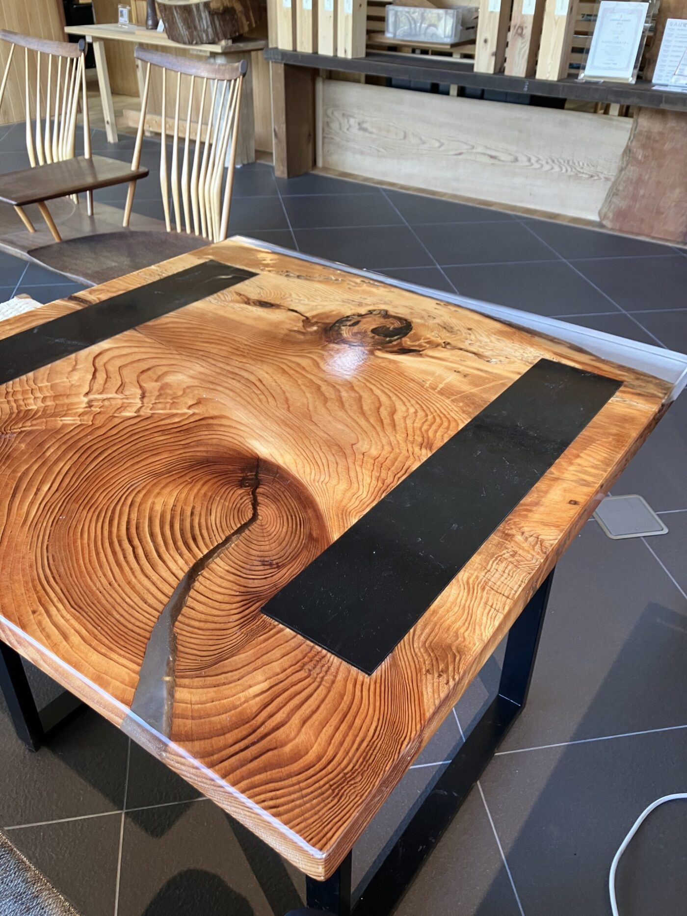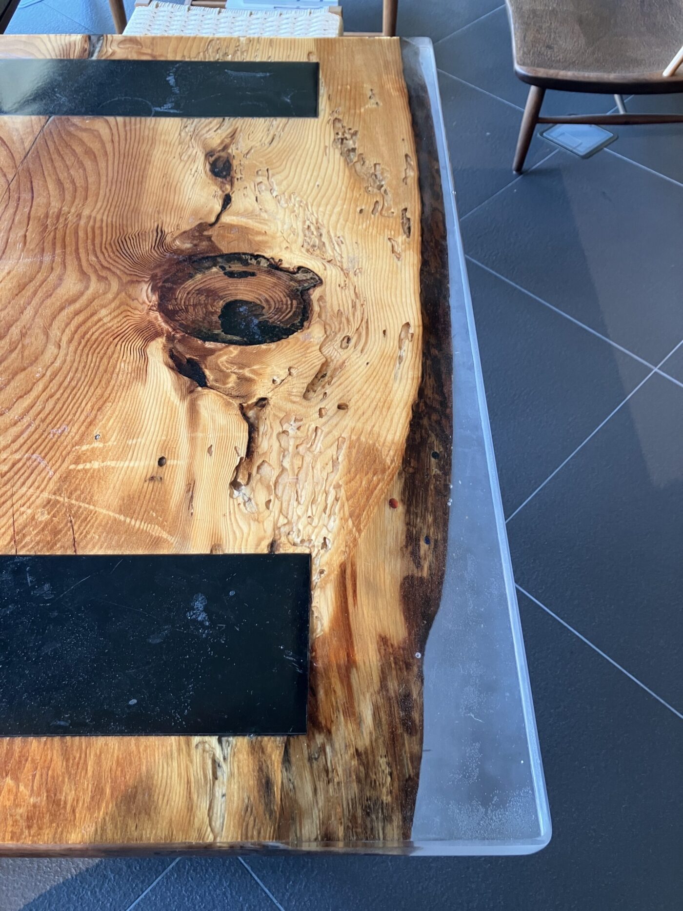 大山松の荒々しさと割れや窪みや欠けによる欠点をレジンで補う、ハイブリッド仕様にして実用的なテーブルとなりました。