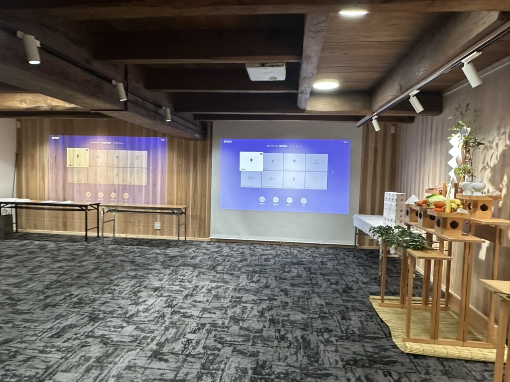 式典の会場に足を踏み入れた瞬間、梁や母屋の太い木組みが堂々と架かる空間の中に、静かで清らかな神事の設えがしつらえられており、伝統と現代性が調和した独特の緊張感に包まれていました。写真にもあるように、かつての蔵の骨格がしっかり残され、その上に新しいギャラリースペースとしての機能が見事に融合しています。