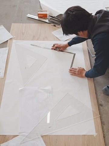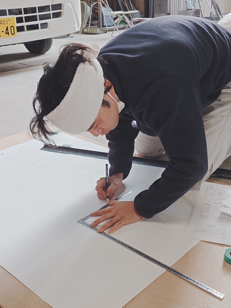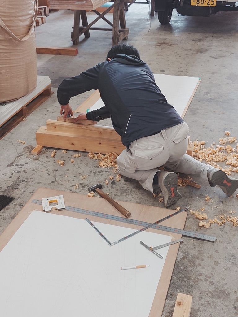そして、本日は片山棟梁が大工技能士1級を目指す、中堅大工を指導してくれました。まずは原寸図という等身大の図面を描き刻む練習から。大工は頭と体を使う仕事で、現場の棟梁としてのリーダーシップも必要です。