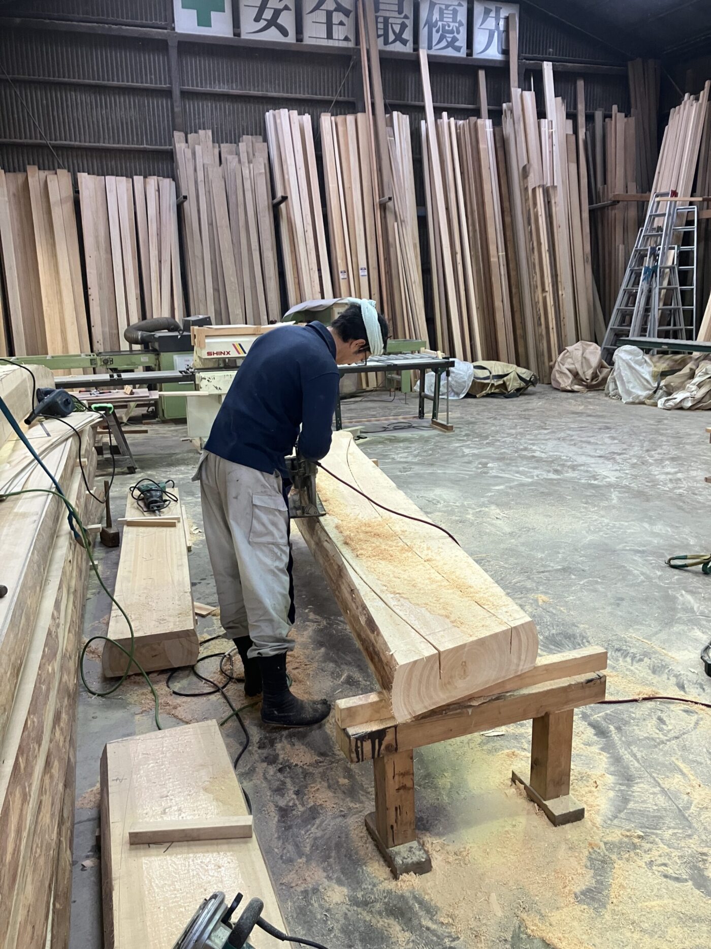 構造材(桧)を直線ではなく、Rに加工中の写真です。