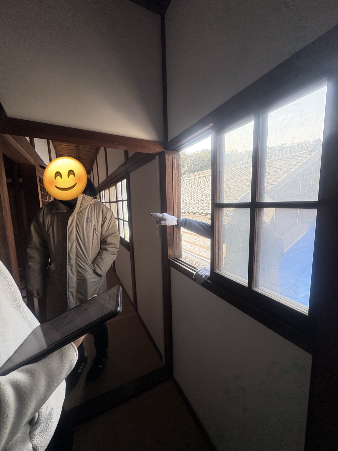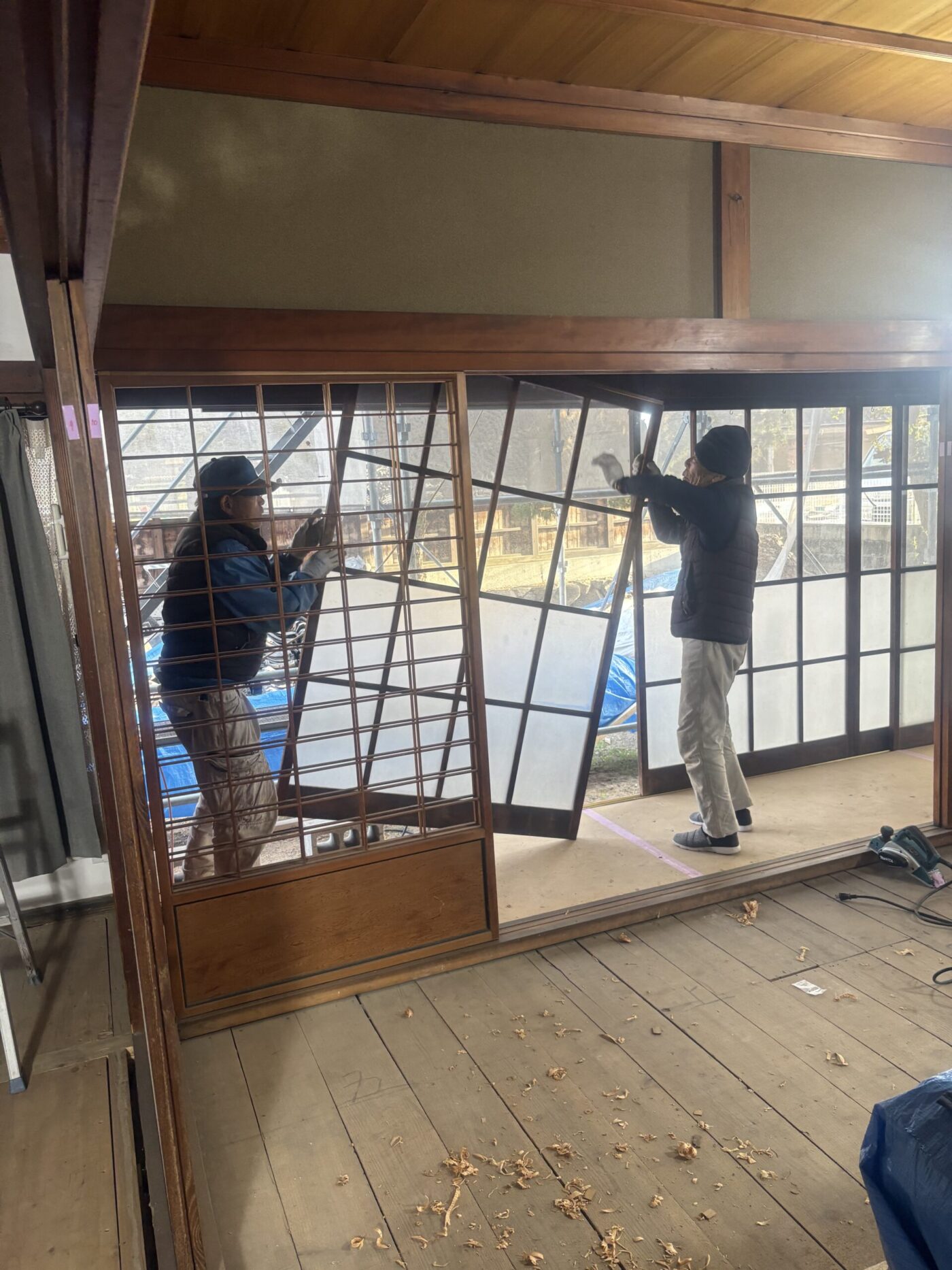 2Fに上がると、そこで構えている大工さん。全くびくともしなかった建具を調整し、全ての建具がスルスル動く姿をお客様にご実感頂くと、「大変だったんだ」と
