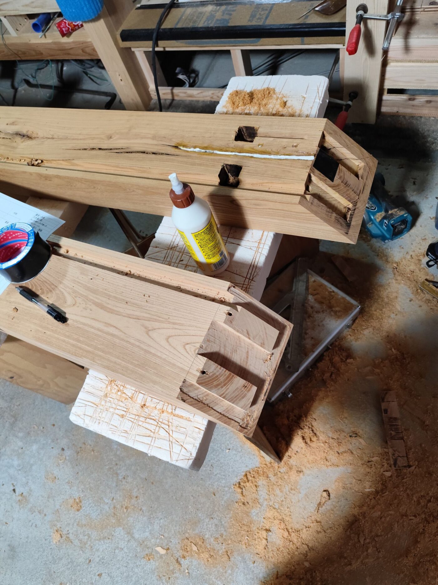 目地を切り、ヌスミを入れ、ボルトで引くようです、構造用合板のしゃくりも入ってますね。