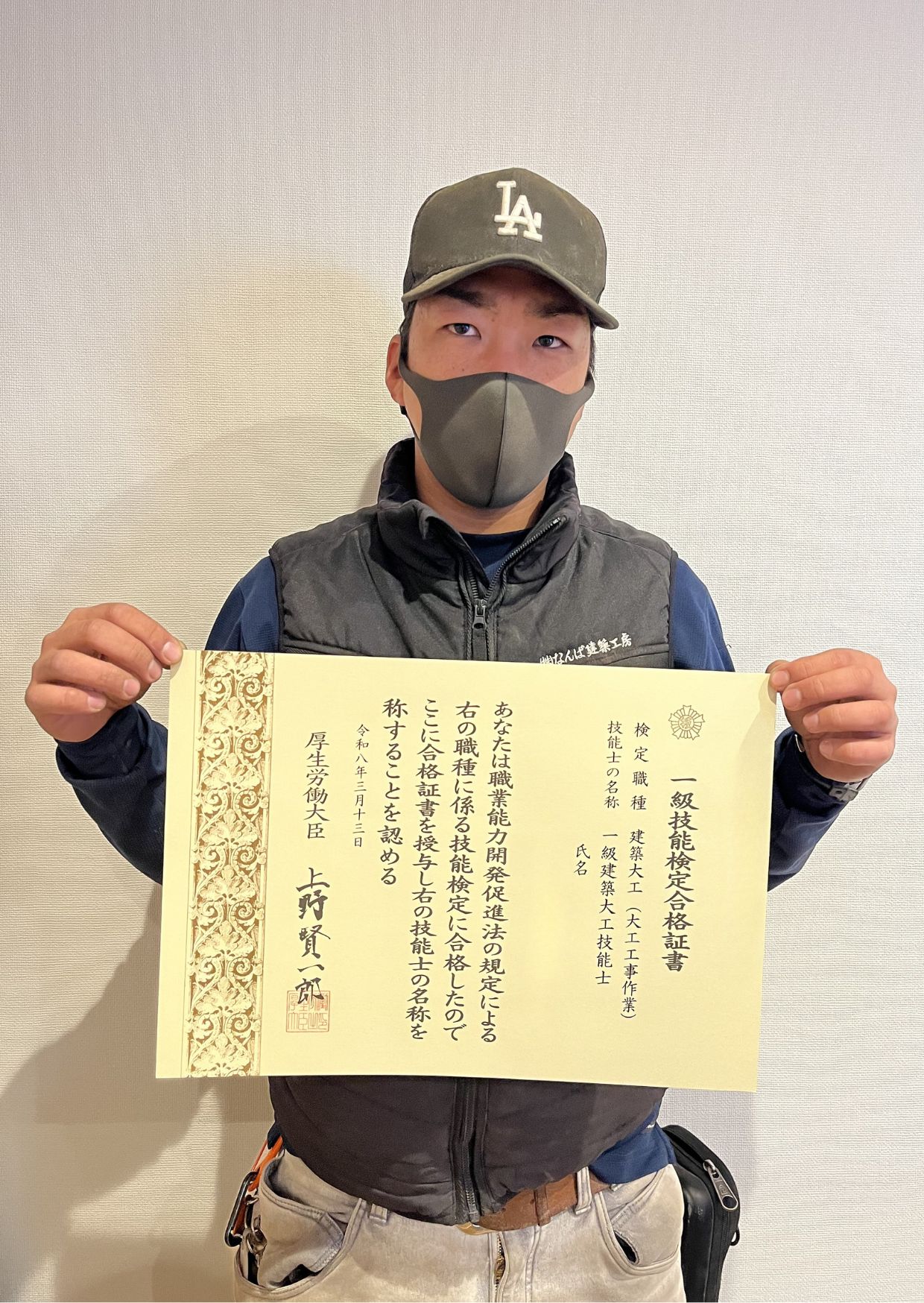 このたび、なんば建築工房の若手大工2名が「大工技能士1級」に合格しました。