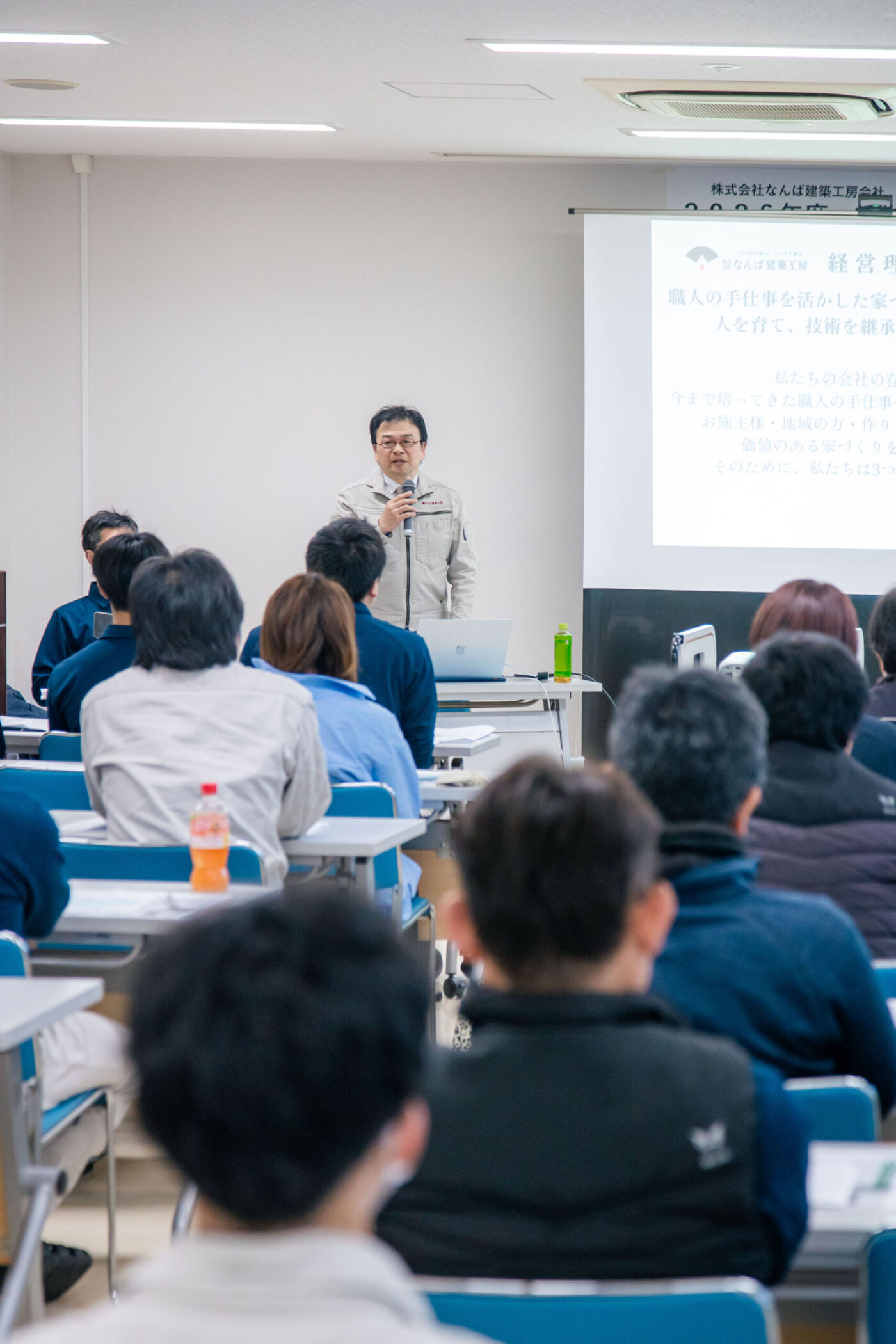 4月4日、毎年恒例の経営方針発表会を行いました。今年で14回目、そしてなんば建築工房は創業139年目を迎えます。この会は、単に今年の数字や目標を確認する場ではありません。私たちがどんな思いで家づくりに向き合い、古民家再生や地域との関わりに取り組んでいくのかを、社員、職人、スタッフみんなで共有する大切な時間です。