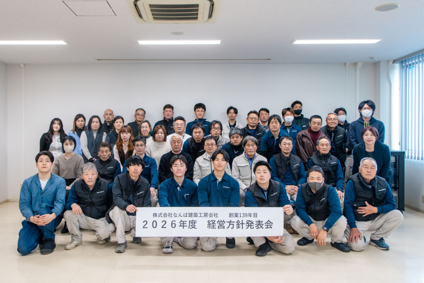 そして、その土台になるのが職人の技術の継承です。技術は、言葉だけでは残りません。現場で伝え、育て、若い人材がそれを自分のものにしていくことで初めて次へつながります。今年の発表会では、新しいメンバーの姿を見ながら、あらためてこの流れを大事にしたいと感じました。外部環境は厳しい時代ですが、スタッフや職人を信じ、なんば建築工房らしく、家づくり、古民家再生、そして地域のまちづくりに全力で取り組んでいきます。これからも、昔の棟梁のように地域に必要とされる会社を目指して、一歩ずつ進んでまいります。