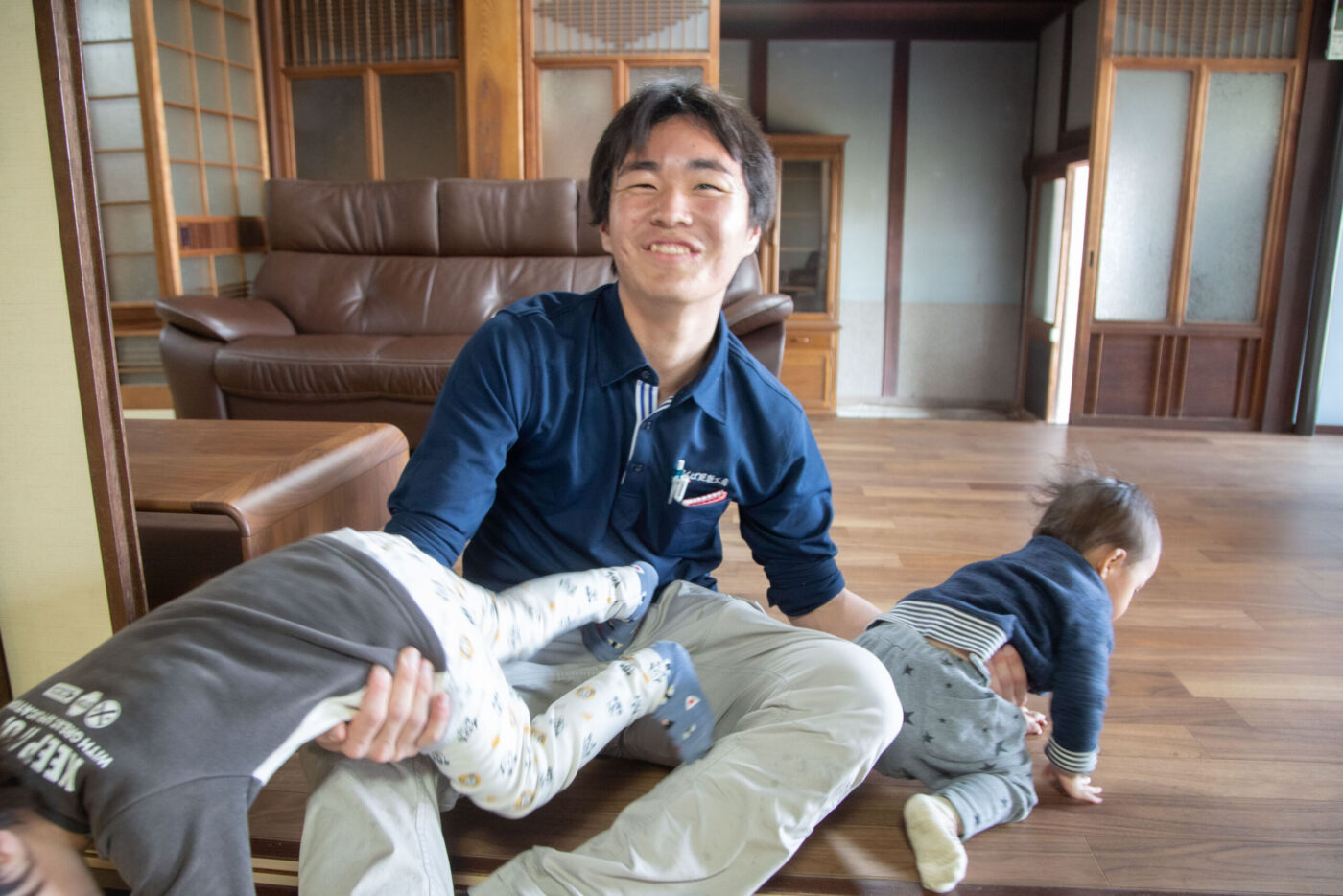 設計士の田中さんがお客様と打ち合わせ、広報のカメラマン濱野さんが解体前のBeforeの写真を撮っている間、子供たちが打合せの邪魔にならないように、僕はひたすら子供たちと追いかけっこをして遊んでいました。