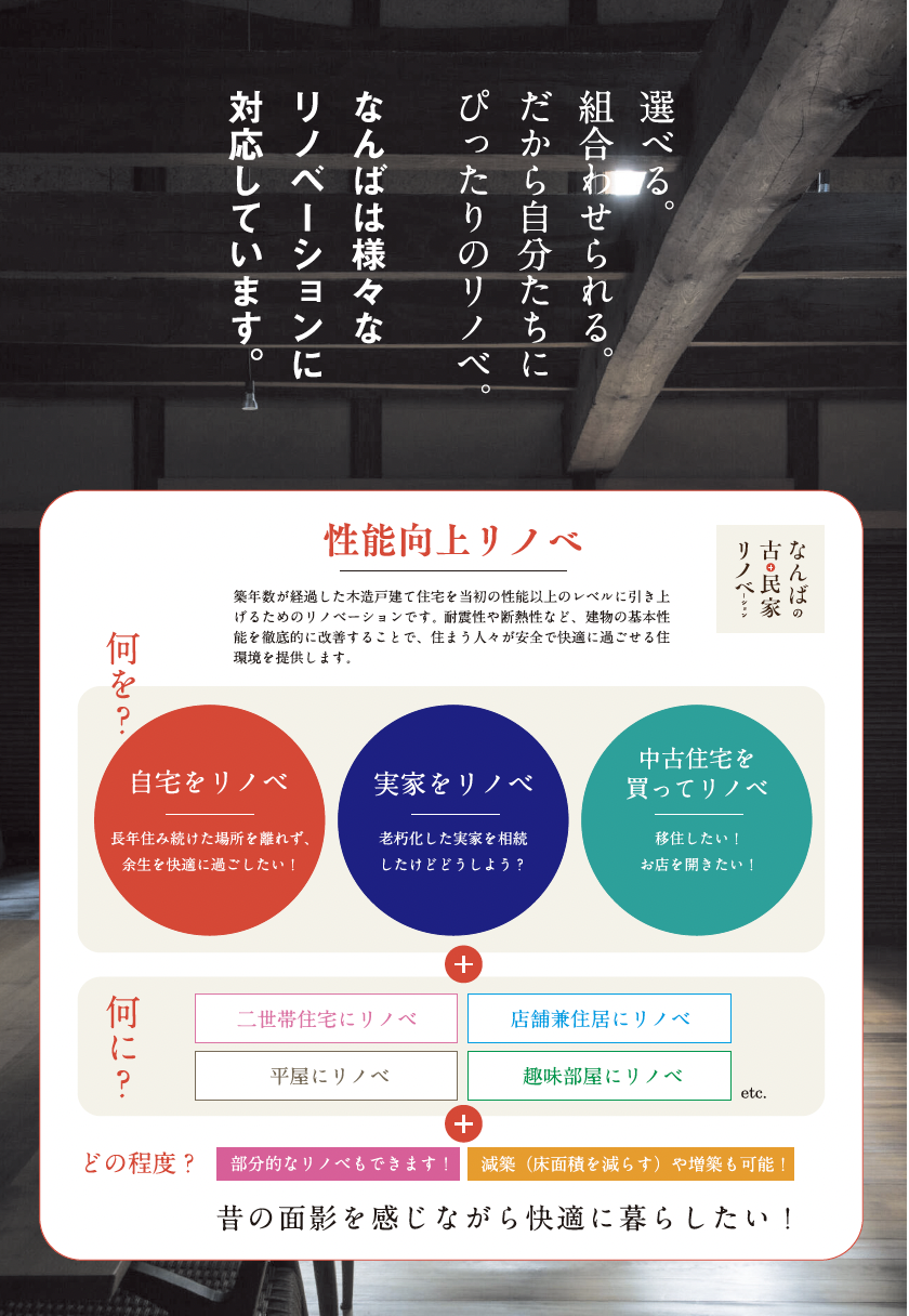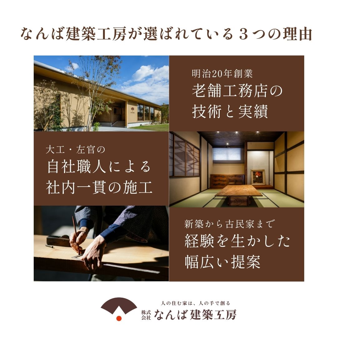 なんば建築工房では、創業から138年、職人の手仕事にこだわり、確かな技術と積み重ねてきた知識をもとに、新築から古民家まで幅広くご提案が可能です。