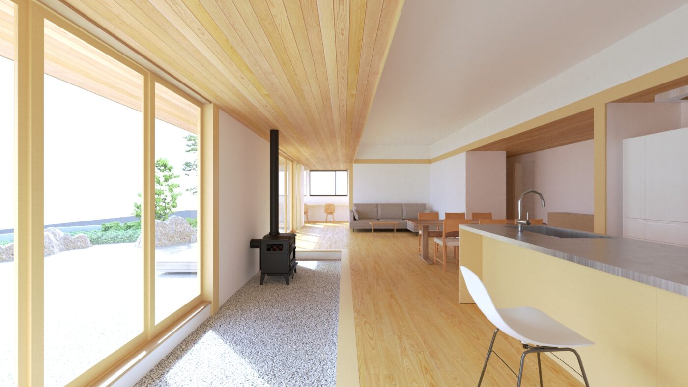 LDKは南側に面するように配置し、室内とウッドデッキがゆるやかにつながる開放的な空間で、土間に据えた薪ストーブが、季節を問わず家族の集まる場所をつくります。