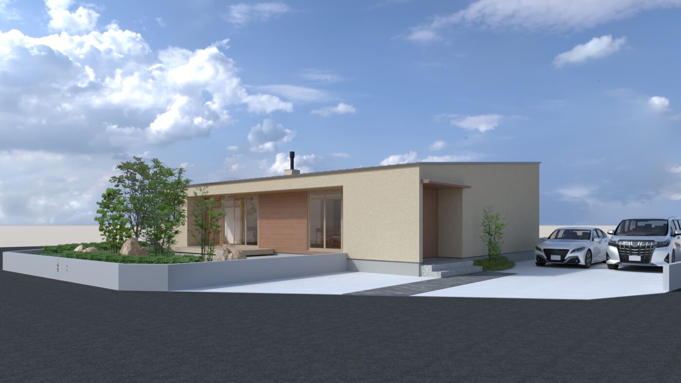 すっきりとしたデザインの平屋で、外壁・内壁には自然素材のそとん壁を採用し、時とともに深まる風合いを楽しめます。